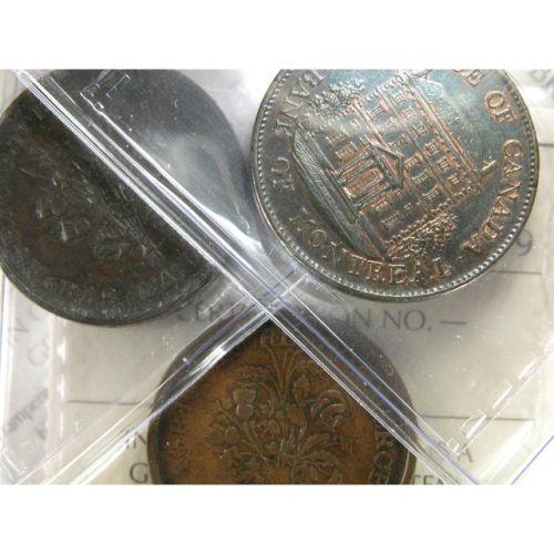 Breton 702 Bouquet Sou, Eighteen Cherry Leaves, One Shamrock, LC-28, ICCS EF-45. Plus Breton 679 Bouquet Sou, Sixteen Cherry Leaves, Seven Shamrocks, Copper, LC-24A1, and Breton 527, Bank of Montreal 1844 Halfpenny, Heavy Trees, Long Nose, PC-1B4, both ICCS EF-40