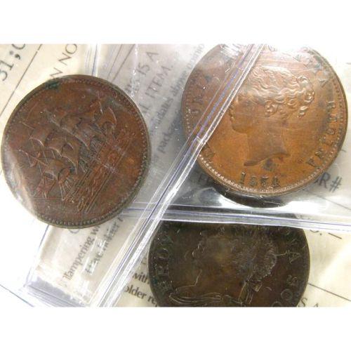 Breton 912 New Brunswick 1854 Half Penny, NB-1B, ICCS EF-45. plus Breton 997 Ships, Colonies & Commerce, Lees 31, PE10-31, ICCS EF-40; Corrosion and Breton 871 Nova Scotia 1832 Half Penny, NS-1D1, ICCS VF-30