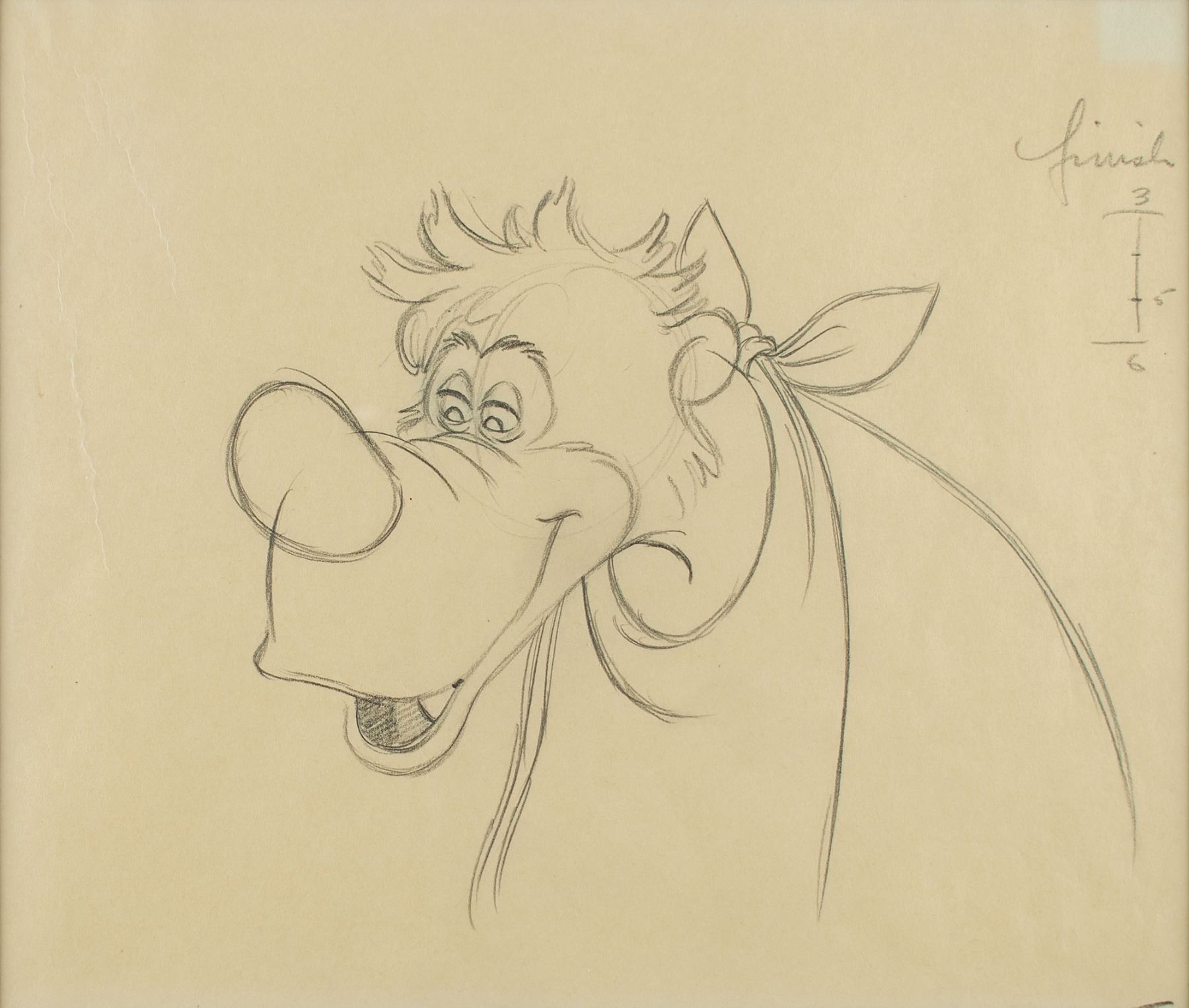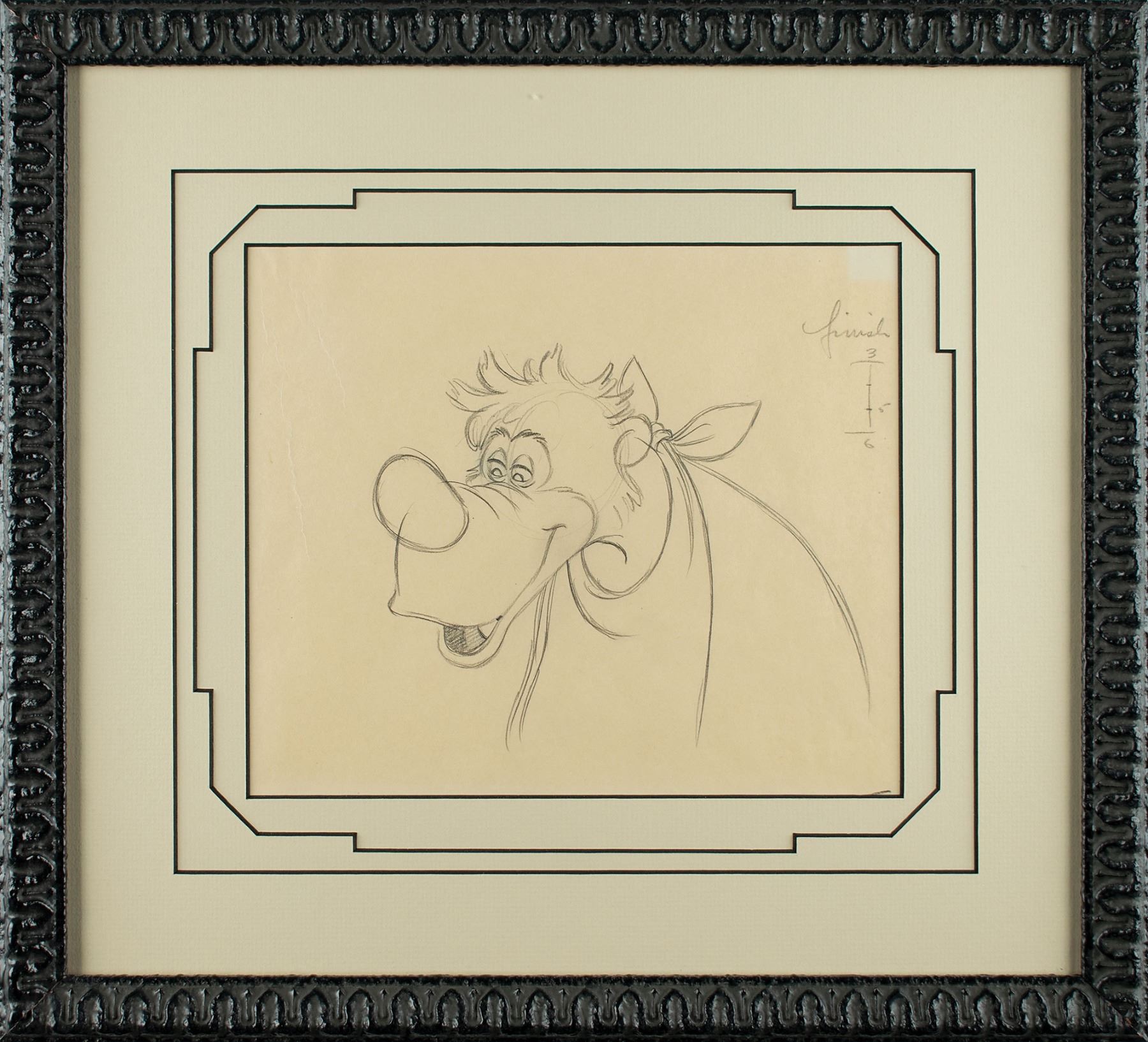 (Walt Disney Studios, 1946) Original production drawing of Br'er Bear from Song of the South, which depicts the large bear in a close-up pose wearing a bib. Accomplished in graphite on untrimmed 10 x 8.5 animation paper. Image measures 7.75 x 6.25. Triple-matted and framed to an overall size of 17.5. x 16. In fine condition.