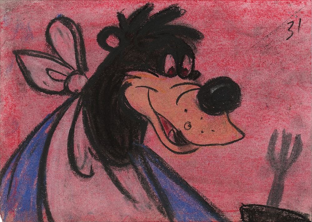 (Walt Disney Studios, 1946) Original storyboard drawing featuring Br'er Bear from Song of the South, showing him in a close-up pose, wearing a bib with fork in hand. Accomplished in oil pastel and graphite on a 7 x 5 sheet, with Walt Disney Productions studio stamp on the reverse. Marked "31" in the upper right corner. In fine condition.