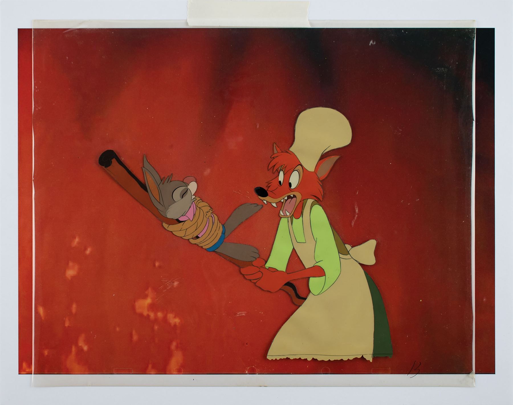 (Walt Disney Studios, 1946) Original production cel of Br'er Fox and Br'er Rabbit from Song of the South, which shows the fox preparing to roast the rabbit on a stick. The cel is placed on a matching 14 x 11 laser background from the same film. Total character image measures 8 x 6.75, with the cel marked "13" in the lower right. In fine condition, with some light scuffing.