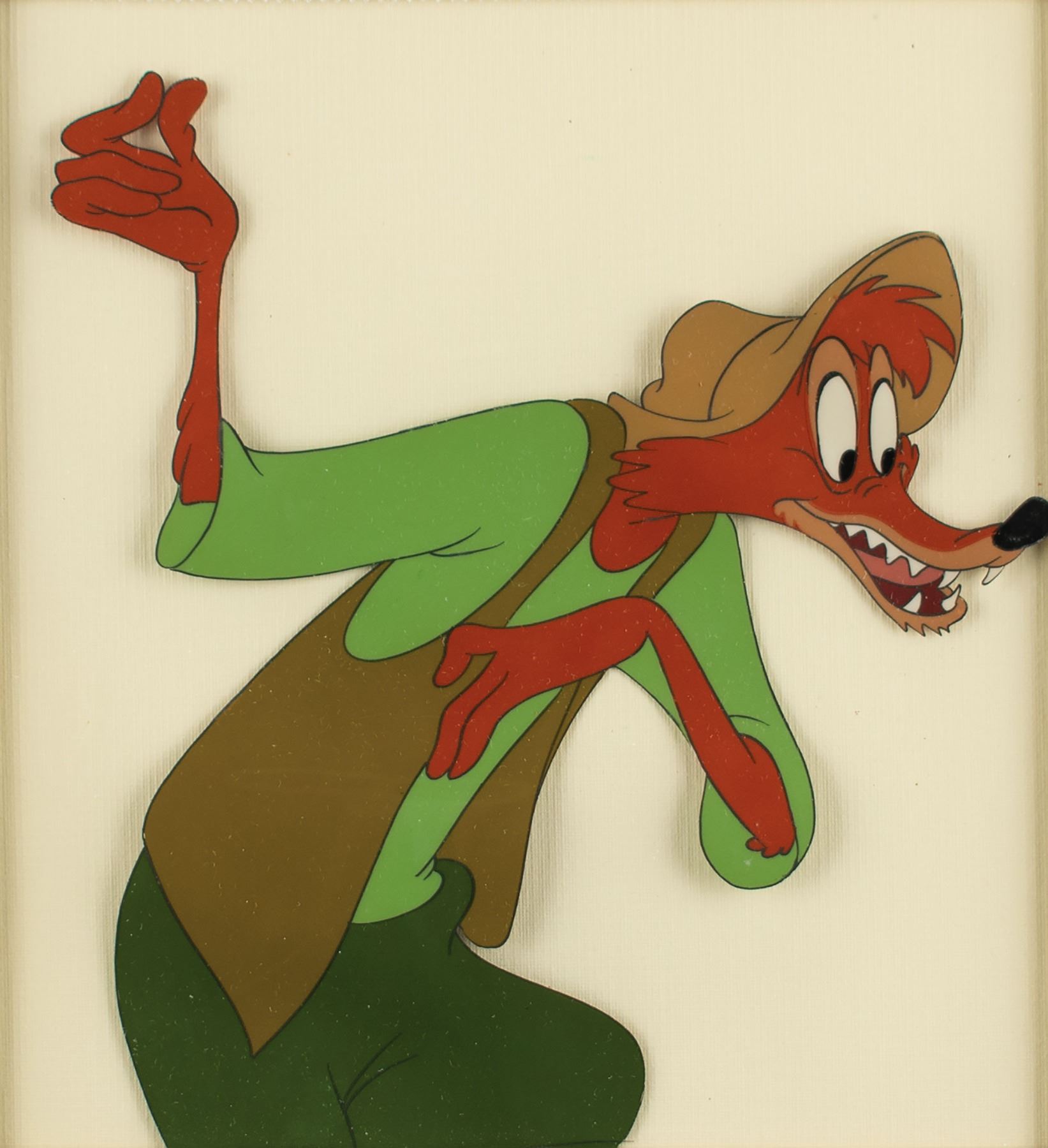 (Walt Disney Studios, 1946) Original production cel of Br'er Fox from Song of the South, showing the crafty fox in a half-length talking pose. The cel is trimmed to 5.5 x 7.75. Image measures 5 x 5.25, with a mat opening of 5.25 x 5.75. Triple-matted to an overall size of 11 x 12. In fine condition.
