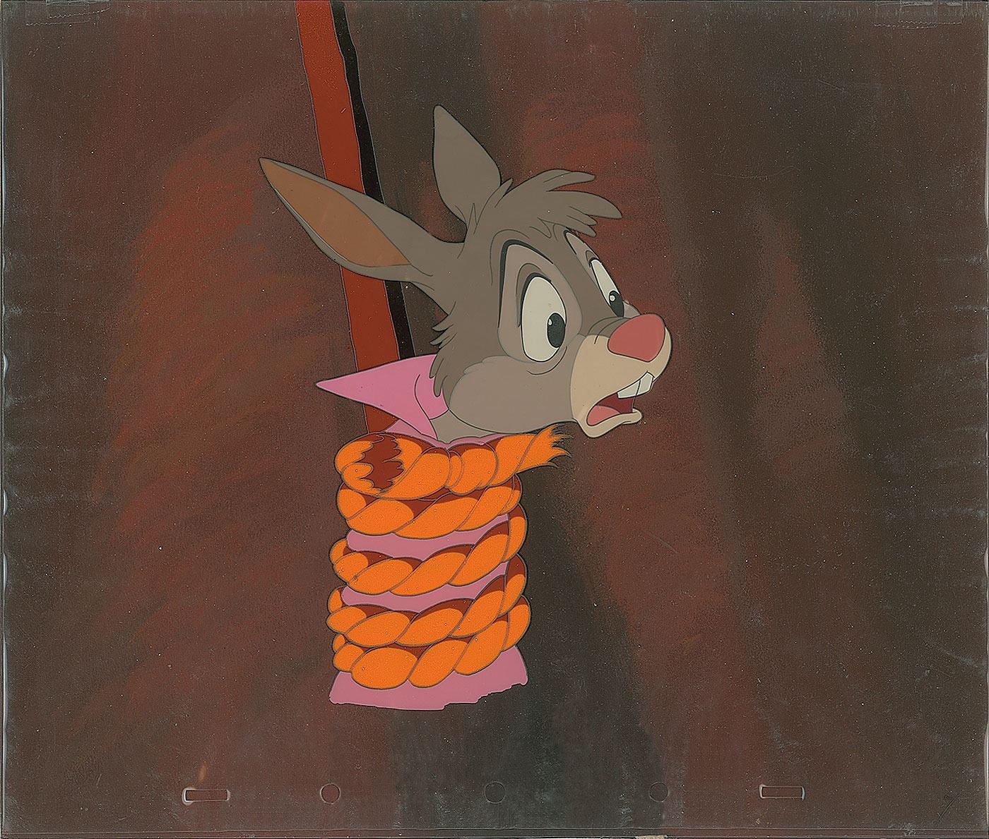 (Walt Disney Studios, 1946) Uncommon original production cel featuring Br'er Rabbit from Song of the South, showing him tied up with rope. The cel is placed on a modern hand-painted custom prepared background. Image measures 5 x 8.5, with overall dimensions of 11.75 x 10. In fine condition.