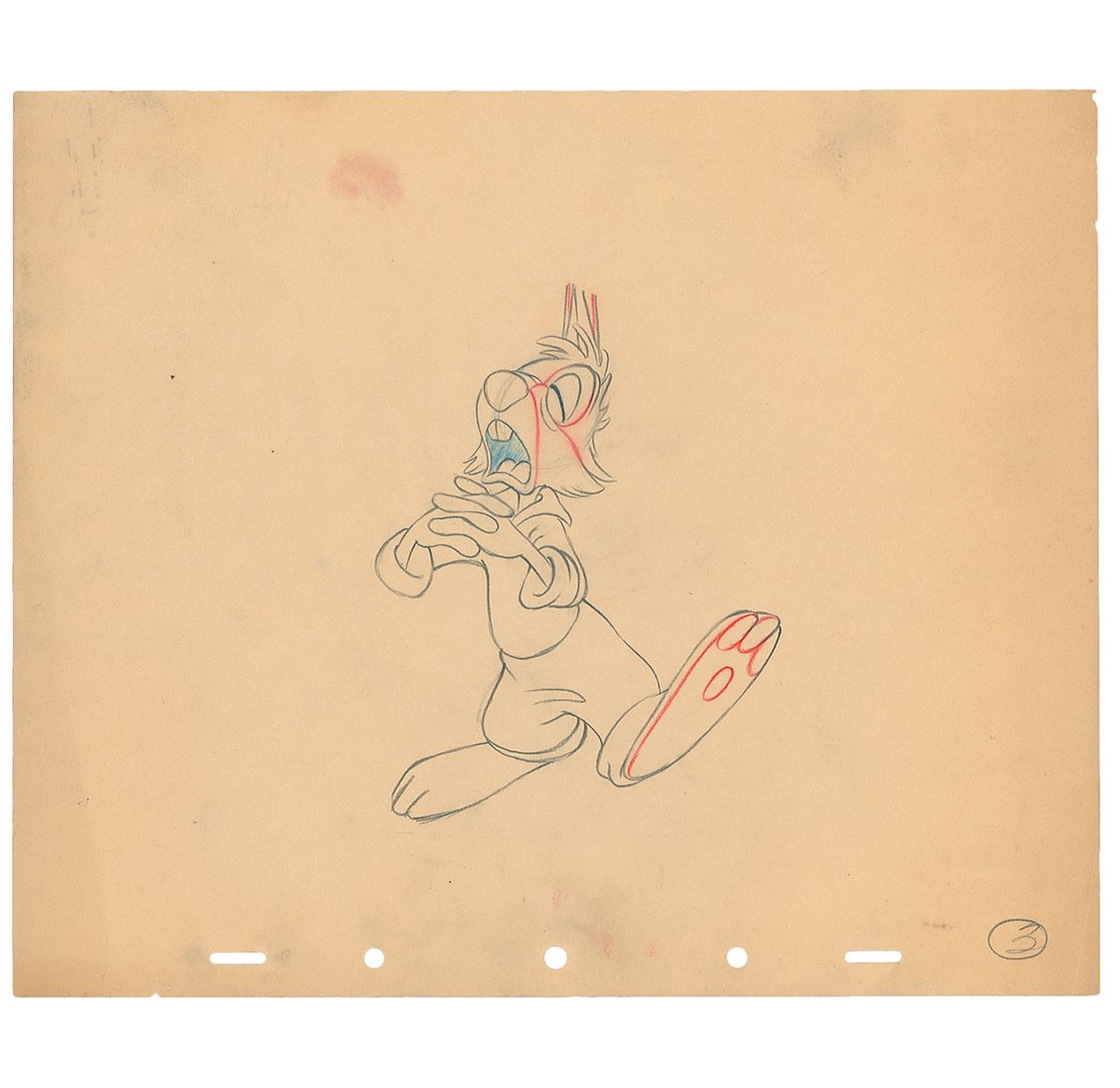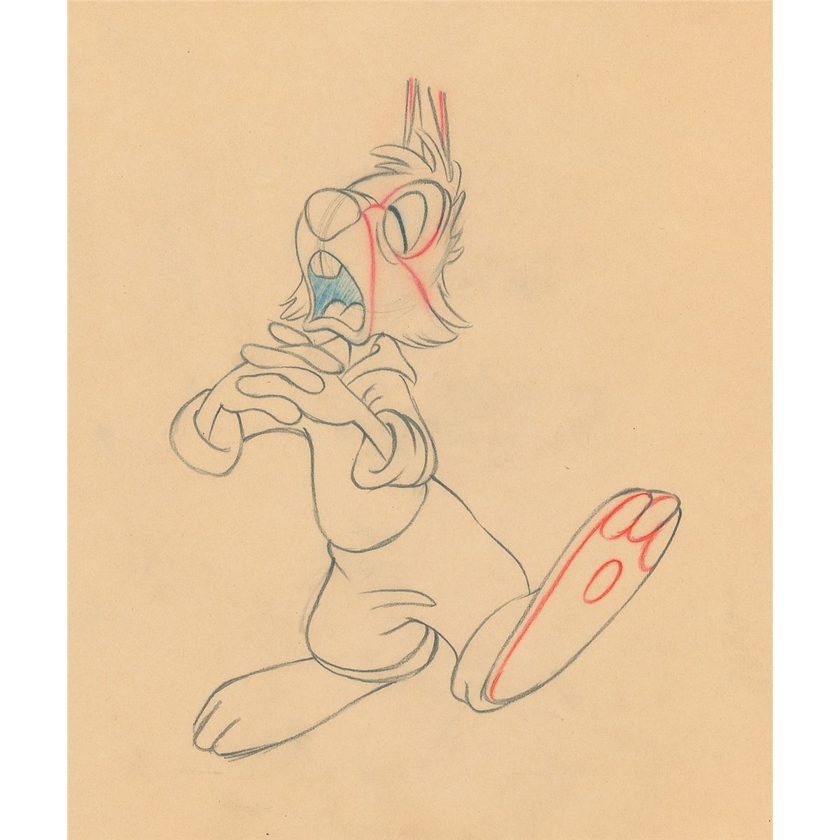(Walt Disney Studios, 1946) Scarce original production drawing featuring Br’er Rabbit from Song of the South. Accomplished in colored pencil and graphite on untrimmed 12 x 10 animation paper. Full-length image of Br’er Rabbit measures 4.75 x 6. In fine condition.