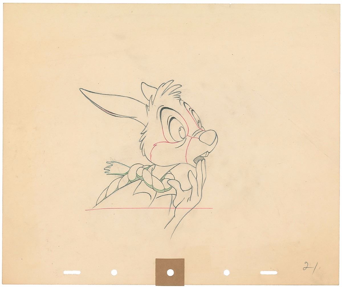(Disney, 1946) Rare original production drawing featuring Br’er Rabbit from Song of the South, showing him with a rope around his neck. Accomplished in graphite and colored pencil on untrimmed 12 x 10 animation paper. Image measures 5 x 5.5. In fine condition, with slight creasing (not affecting image).