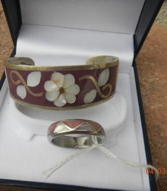 Bracelet and Ring very similar in style. They both have mother of pearl. The Bracelet measuring 6 inches by 1 inch. It is marked possibly "Alpa, Mex" but name is worn, Shipping $14.00