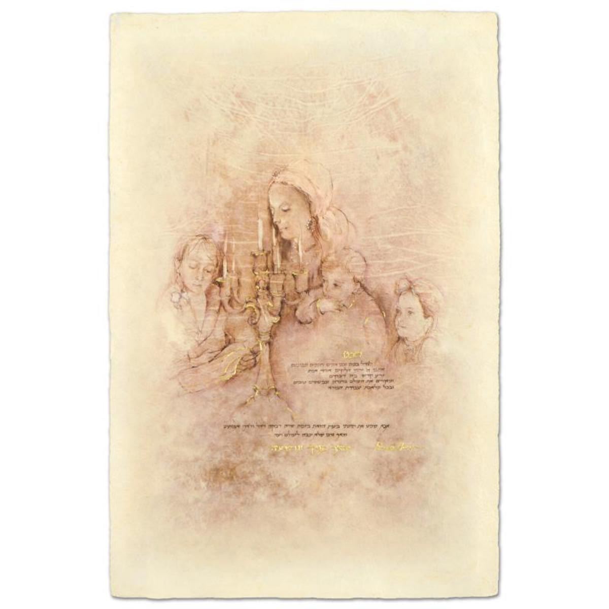 "Hadlakat Nerot Shabt" is a mixed media giclee on handmade Indian paper with goldleaf by Brachi Horen, hand signed by the artist! This creation received personal attention by the artist in the form of water coloring and gilding. Includes Certificate of Authenticity! Measures approx. 15.5" x 23" (with border), 12" x 14" (image). Reference #: 215307