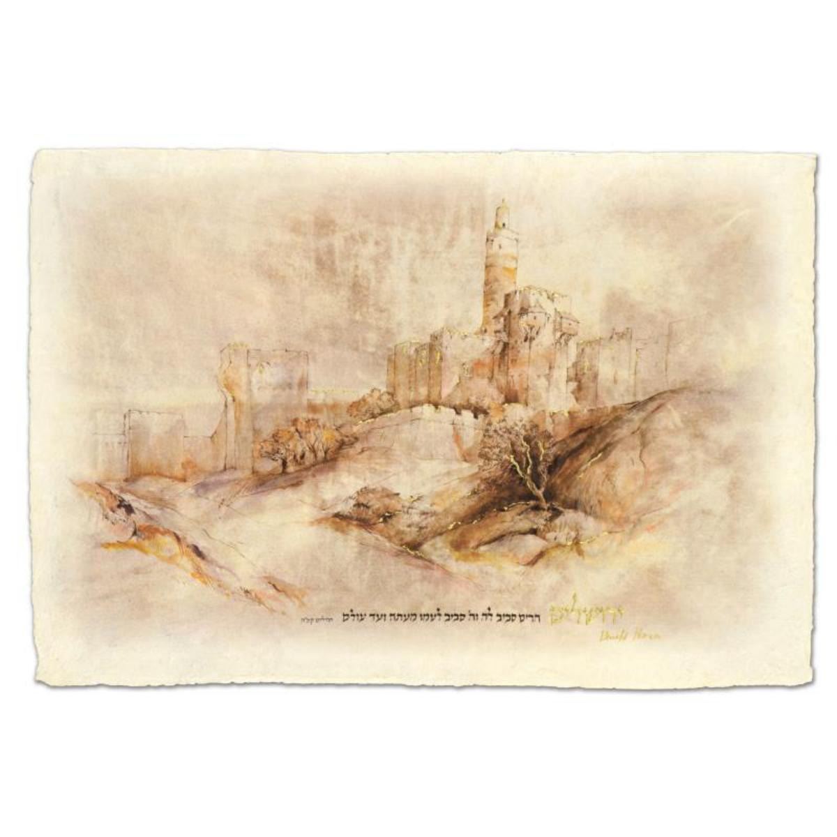 "Migdal David" is a mixed media giclee on handmade Indian paper with goldleaf by Brachi Horen, hand signed by the artist! This creation received personal attention by the artist in the form of water coloring and gilding. Includes Certificate of Authenticity! Measures approx. 23" x 15.5" (with border), 20" x 13" (image). Reference #: 215263
