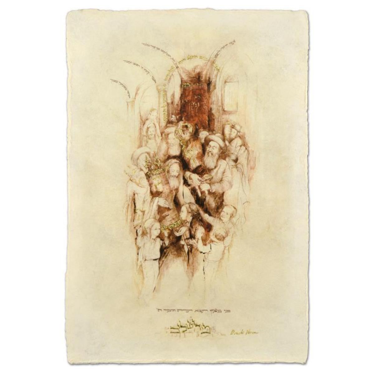 "Miziyon Tetse Torah" is a mixed media giclee on handmade Indian paper with goldleaf by Brachi Horen, hand signed by the artist! This creation received personal attention by the artist in the form of water coloring and gilding. Includes Certificate of Authenticity! Measures approx. 15.5" x 23" (with border), 11" x 20" (image). Reference #: 215276