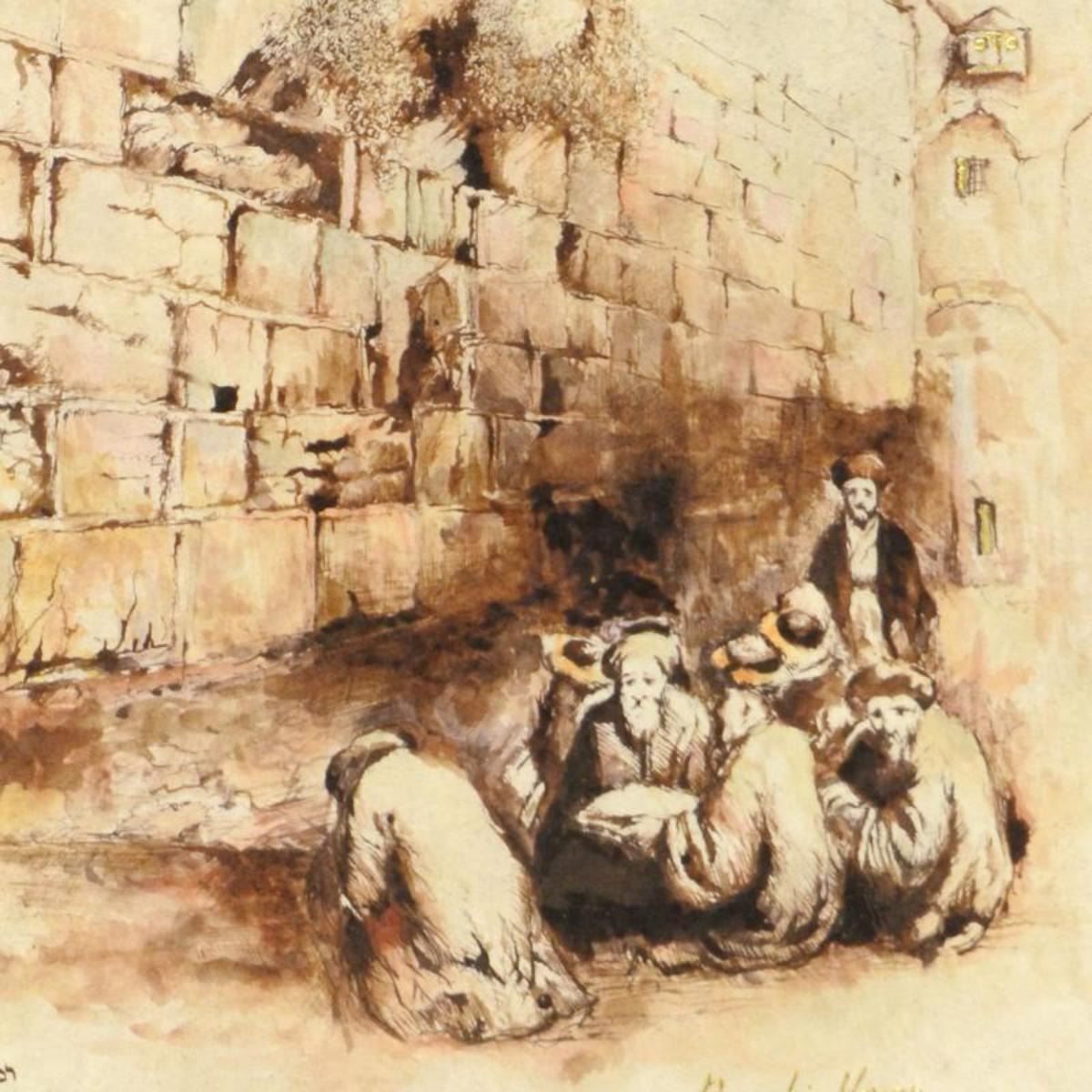 "Prayer At The Kotel" is a mixed media giclee on handmade Indian paper with goldleaf by Brachi Horen, hand signed by the artist! This creation received personal attention by the artist in the form of water coloring and gilding. Includes Certificate of Authenticity! Measures approx. 23" x 15.5" (with border), 18" x 13" (image). Reference #: 215257