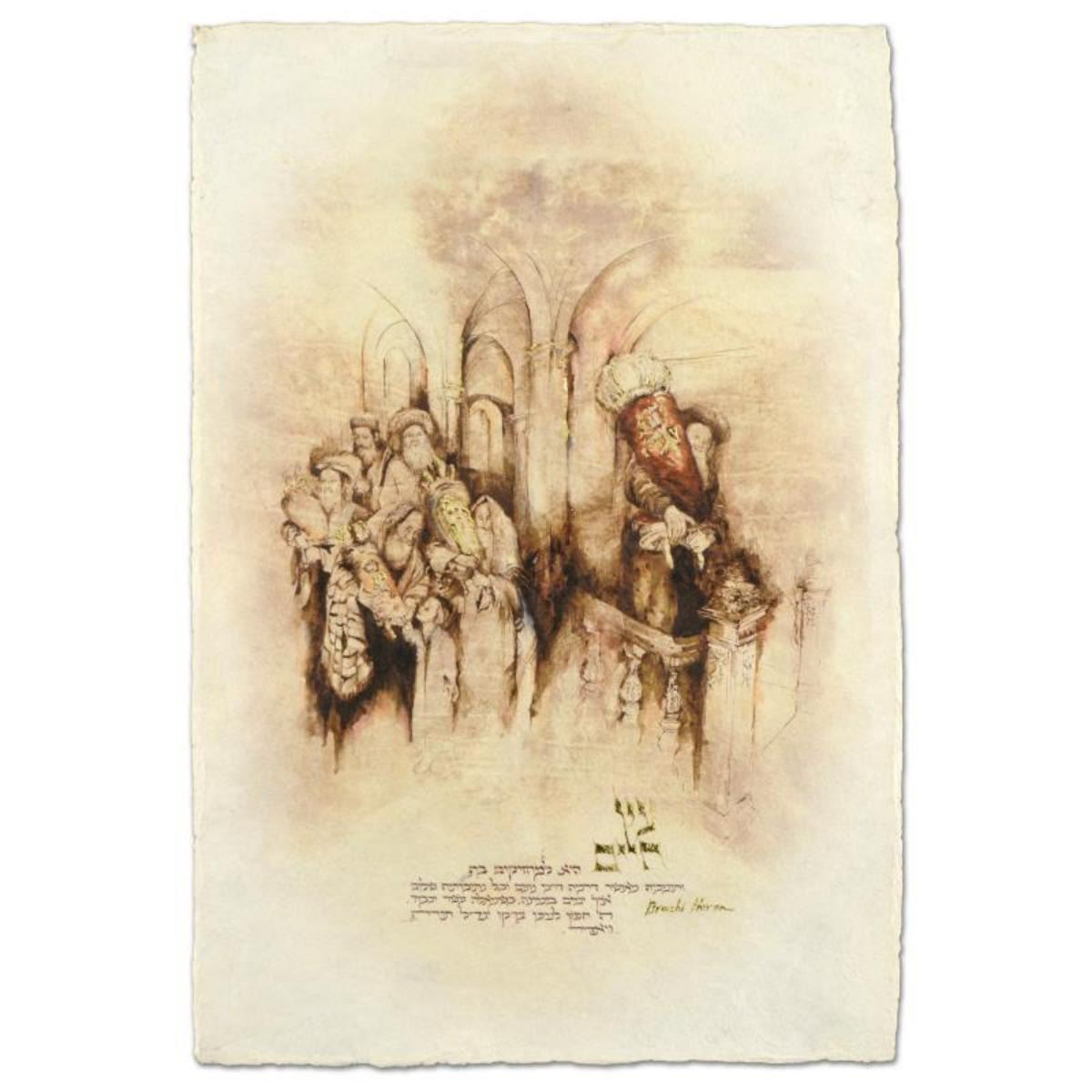 "Western Wall" is a mixed media giclee on handmade Indian paper with goldleaf by Brachi Horen, hand signed by the artist! This creation received personal attention by the artist in the form of water coloring and gilding. Includes Certificate of Authenticity! Measures approx. 15.5" x 23" (with border), 14" x 20" (image). Reference #: 215299