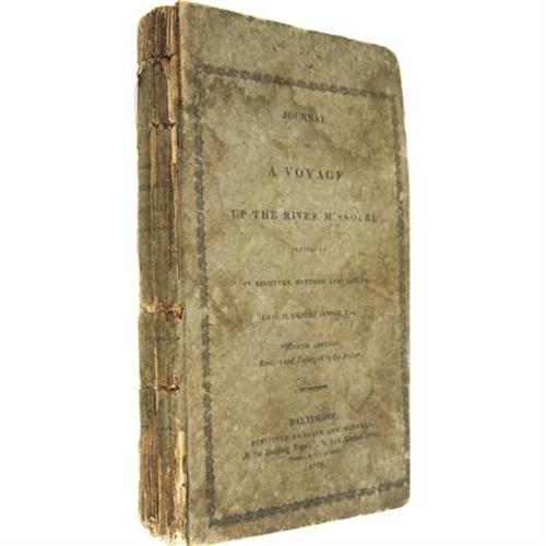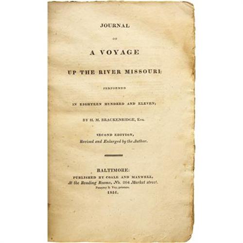 <B>H. M. Brackenridge. </B></I><B><I>Journal of a Voyage up the River Missouri Performed in Eighteen Hundred and Eleven.</B></I></B></I> Baltimore, Maryland: Coale and Maxwell, 1816. <BR>Second edition. Twelvemo. 242 pages. Table of Distances<I> </B></I>at end. <BR><BR>Gray paper boards. Binding is quite loose with paper loss along spine. Interior leaves are water damaged and age toned, but still completely legible. This unassuming book is an absorbing and important piece of early Americana. Brackenridge (1786-1871) was a lawyer and an author known for his wit, wide range of interests, and liberal political philosophy. In 1811 he accompanied the great fur trader Manuel Lisa on an expedition up the Missouri River past Mandan villages to the Missouri Fur Company's fort, and recounted his experiences in this amazing journal.<BR><BR><b>Shipping:</b> Books & Catalogs (<a target="_blank" href="http://www.heritageauctions.com/common/shipping.php">view shipping information</a>)