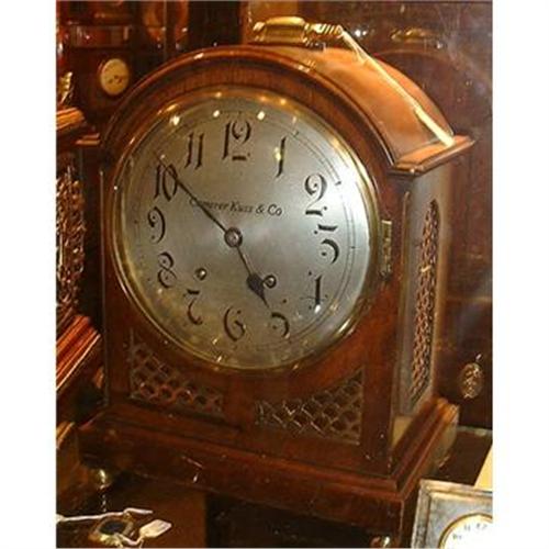 A very imposing mahogany bracket clock by Camerer Cuss and Company, London with a silvered dial and quarter striking movement. This clock is in excellent condition and good working order. This clock was probably made in England as it is of the highest quality and the movement which is very fine imported from Germany.