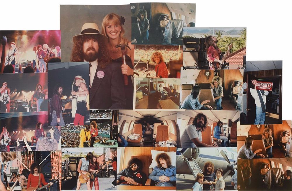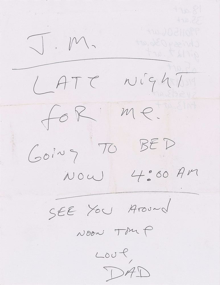 Handwritten note to his son John-Michael, signed "Dad," one page, 8.5 x 11, in full: "J.M. Late night for me. Going to bed now 4:00 AM. See you around noon time. Love, Dad." Includes an assortment of 20 photos, mostly consisting of modern reproductions of vintage photos; two are original vintage candids from July 1979 showing the band traveling, and one is a vintage color 8 x 10 pertaining to the song 'Mean Woman Blues,' showing Delp in the outfit he wore for a promo shoot for Barry Goudreau's solo album. In overall fine condition, with intersecting folds to the note and a large crease to one photo. From the Brad Delp Collection, and accompanied by a letter of provenance from Micki Delp.