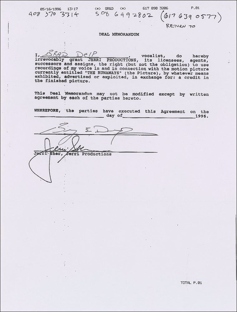 Partly-printed DS, filled out in his own hand, "Brad Delp," and signed “Bradley E. Delp,” one page, 8.5 x 11, 1996. A deal memorandum for a soundtrack, in part: "I, Brad Delp, vocalist, do hereby irrevocably grant Jerri Productions…the right (but not the obligation) to use recordings of my voice in and in connection with the motion picture currently entitled 'The Runaways.'" Includes an original audio cassette tape of the soundtrack for the film, annotated in Brad Delp's own hand on the label, "Music for 'The Runaways,'" with the track listing insert also filled out by Delp. In fine condition, with scattered creasing to the document. Brad Delp collaborated with Boston bandmate Gary Pihl for the soundtrack to the small independent film, which featured his son, John-Michael Delp, as an actor. From the Brad Delp Collection, and accompanied by a letter of provenance from Micki Delp.