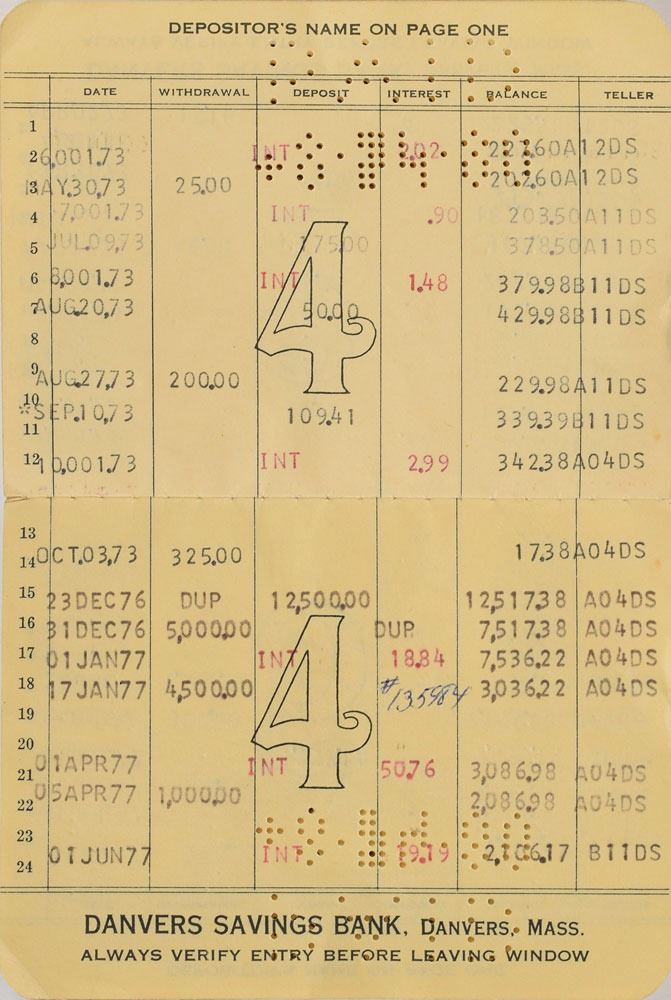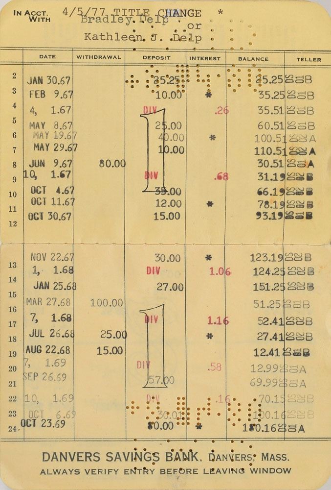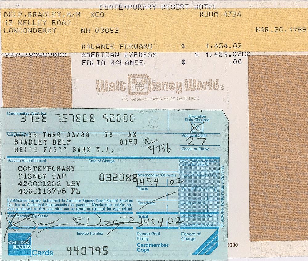 Brad Delp's Danvers Savings Bank deposit book, twelve pages, 3.5 x 4.5, with the earliest deposit of $25.25 dating to January 30, 1967, when Delp was just 15 years old. The pages record small withdrawals and deposits over the course of the next several years, pausing for a three-year period beginning October 1973, at which time the balance of the account is just $17.38. The next activity occurs on December 23, 1976—four months after the release of Boston's debut album—with the deposit of a whopping $12,500. The balance then dwindles over the next four years, with the last activity recorded in August 1980. In very good to fine condition. Accompanied by a carbon copy of Delp's American Express receipt for a stay at Walt Disney World's Contemporary Resort Hotel in March 1988, bearing the carbon impression of his signature; stapled to the document is the hotel's receipt. Also includes a small satin-finish photo of Delp with Goofy at Disney World—which Micki Delp notes was Brad's favorite place in the world. An interesting chronicle of Delp's finances from his early life through his journey to stardom. From the Brad Delp Collection, and accompanied by a letter of provenance from Micki Delp.