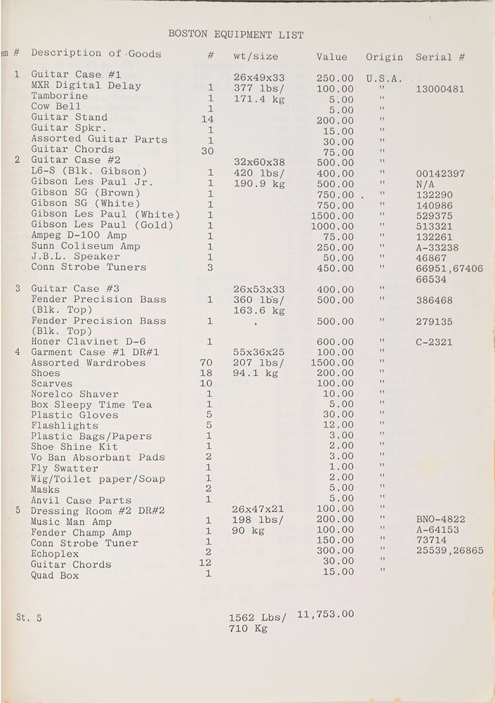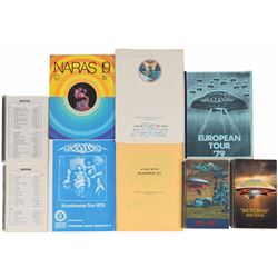 Brad Delp's collection of Boston tour itineraries and awards programs, including: a thick itinerary book for the “European Tour ’79,” listing points of contact, venue information, schedules, contract rider, crew and band member manifest, and equipment list; a separate itinerary booklet for Boston’s “Scandinavian Tour 1979,” detailing their schedules, accommodations, and venues for the Scandinavian leg of the tour; two spiral-bound itinerary books for Boston’s 1995 tours, one for June 18–July 18, and the other for July 18–August 7, detailing venues, accommodations, and points of contact; a spiral-bound itinerary book for Boston’s tour of the US in the summer of 1997; and a spiral-bound itinerary book for their 2003 “Returns” tour. Also includes a two-page tentative schedule for Boston’s 1996 tour, a press release for the 2003 Delp & Goudreau CD, Delp’s program for the 1977 event “A Day with Muhammad Ali,” two programs for the 1997 Rock Music Awards, and a NARAS program for the 1976 Grammy Awards. In overall very good to fine condition, with expected signs of use. From the Brad Delp Collection, and accompanied by a letter of provenance from Micki Delp.