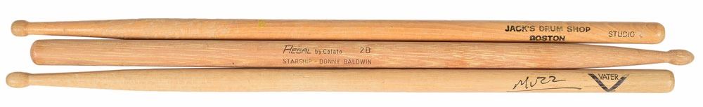 Three drumsticks from Brad Delp's collection associated with three different bands: a Boston drumstick marked on one end with black text, "Jack's Drum Shop, Boston, Studio"; a Beatlejuice drumstick by Vater, marked "Muzz" in black felt tip to signify Beatlejuice drummer John 'Muzz' Muzzy; and a Starship drumstick marked with black text, "Regal by Calato, 2B, Starship - Donny Baldwin." In overall fine condition, with signs of use. Micki Delp notes that Brad originally got the Starship drumstick for their daughter Jenna. From the Brad Delp Collection, and accompanied by a letter of provenance from Micki Delp.