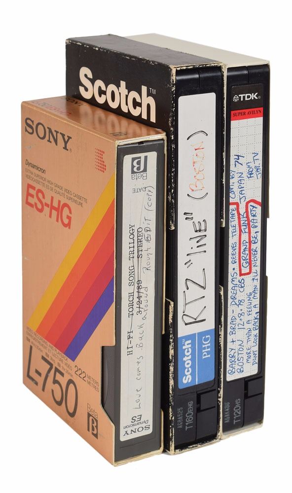 Three video tapes personally-owned by Brad Delp, including: a Sony Beta tape annotated on the label in Delp's own hand, "Love Comes Back Around, Rough Edit (Copy)"; a Scotch VHS tape marked on the label in another hand, "Boston, 6/6/95, Jones Beach, NY," jokingly also labeled "RTZ 'live' (Boston)" on the side; and a TDK VHS tape marked in another hand, "Reeves Teletape - CBS - Barry G. Dreams w/ Superstar Brad Delp, More Than a Feeling, Don't Look Back, A Man I'll Never Be, Party, 12/8/1978," also marked "Grand Funk Japan 74" on the edge. A note slipped inside from a fan says, "Brad, My name is Ted Milley I have an interesting video for you and the guys. You will remember me from Tower Records yesterday," and the outside of the tape box has a Boston logo drawn by Milley. In overall fine condition. From the Brad Delp Collection, and accompanied by a letter of provenance from Micki Delp.