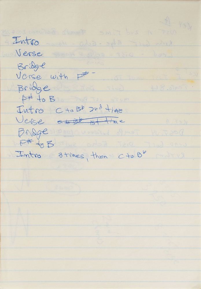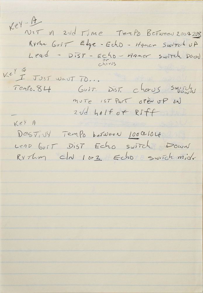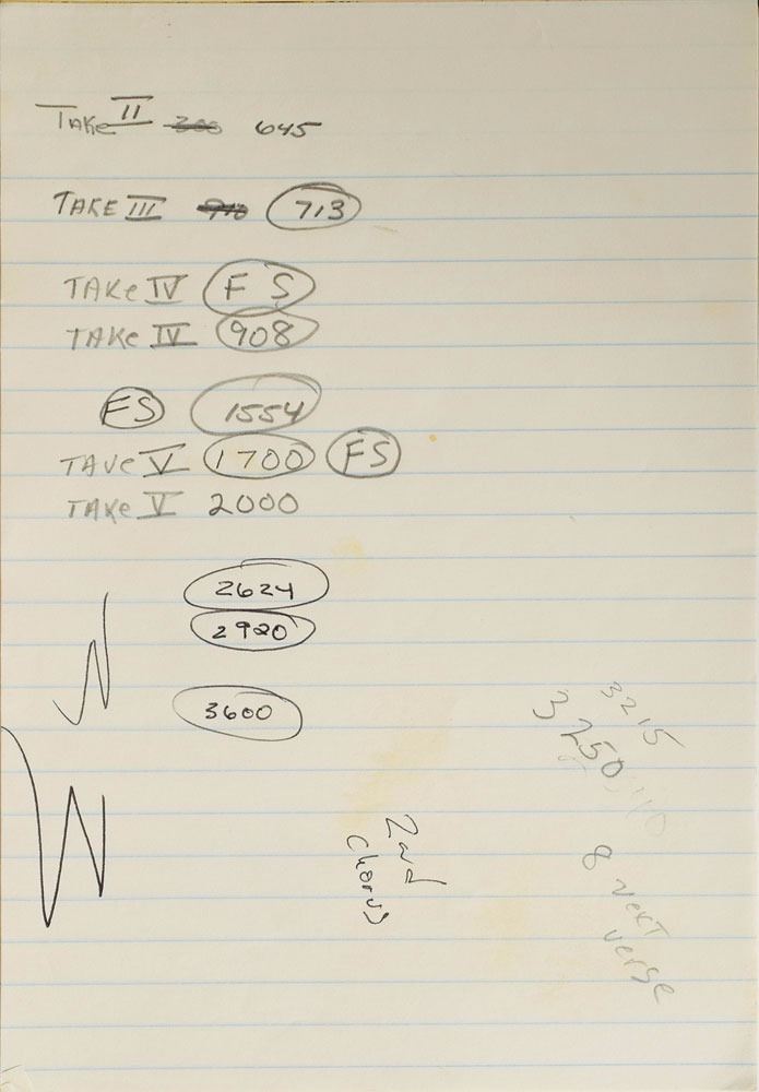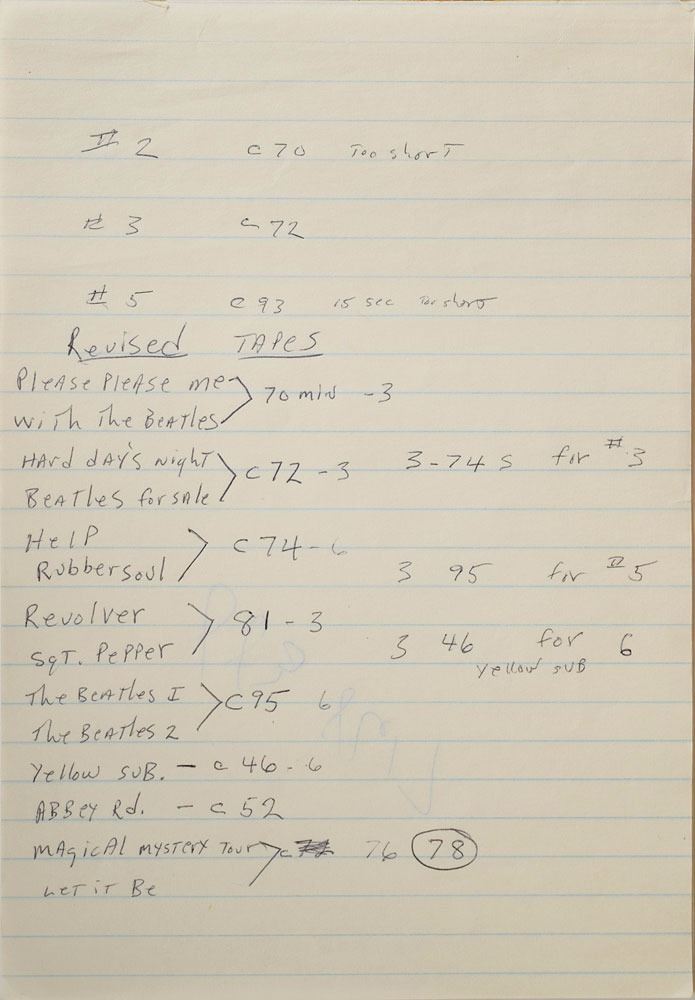 After several blank pages, in the middle of the tablet, there is a page of handwritten notes on Beatles records, headed, "Revised Tapes," listing such classics as "Please Please Me," "With the Beatles," "Hard Day's Night," "Help," "Rubber Soul," "Revolver," "Sgt. Pepper," "Yellow Sub.," "Abbey Rd.," "Let It Be," and others. After several more blank pages there is another page headed "Tuesday," with various production notes concerning channels, trim, and faders. The last page of handwritten notes consists of lyrics entitled "Your Heart Can't Be Denied," beginning: "In your eyes, you're telling me it's time to let go (the truth) / And I've, tried to deny that look but it shows (you've tried) / I know you're trying so hard to be a friend (it's coming to an end) / but I can see that y(our) love is at an end / It's harder to pretend, than to stand and say / what you really feel." The following four pages features diagrams and sketches, apparently of a home and its interior. In very good to fine condition, with some staining and many pages detached. The song 'Tuesday' was never released by Delp, but his friend Charlie Farren released a cover of it in 2013. The other song seems to be both unpublished and unreleased, perhaps never making it beyond this notebook. A unique piece showcasing the creativity of Boston's amazingly versatile frontman. From the Brad Delp Collection, and accompanied by a letter of provenance from Micki Delp.