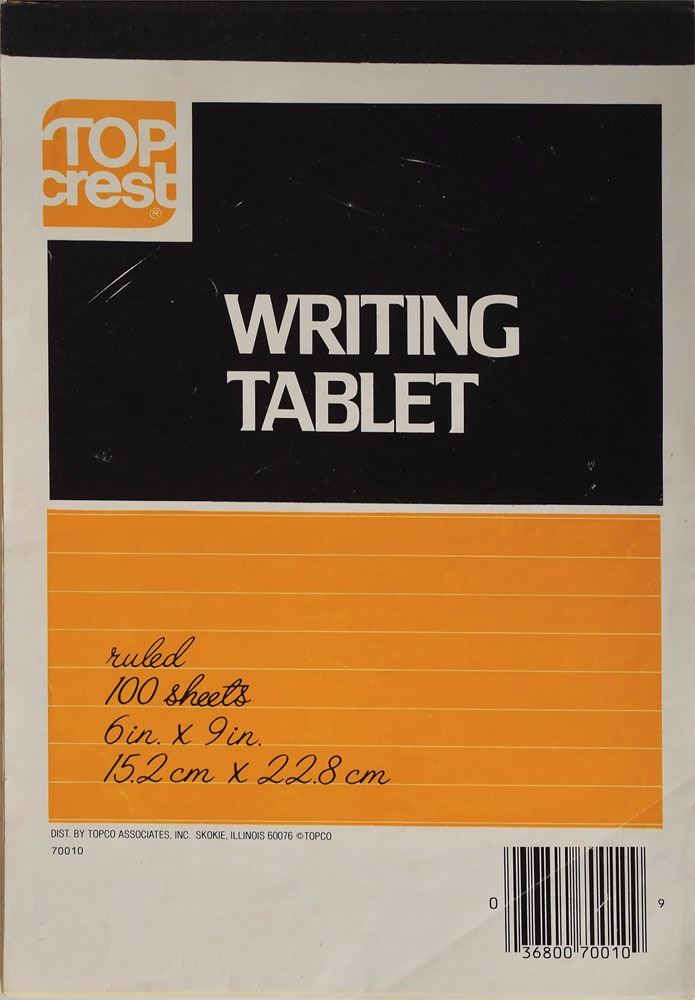 Brad Delp's 'writing tablet' notebook containing lyrics, notes on production, and sketches of a house, 6 x 9, consisting of seven pages of handwritten notes and four pages of sketches. The first page consists of song lyrics, headed, "Tuesday (written 4-28-83)," with the first verse reading: "Tuesday was the day you went away / Wednesday had to come, I cried all day / Thursday it was bad, it took all the strength I had / It's hard to face the thought of you not here." The next page has a short song summary listing sections and changes, in full: "Intro, Verse, Bridge, Verse with F#, Bridge, F# to B, Intro C to Bb 2nd time, Verse, Bridge, F# to B, Intro 3 times, then C to Bb." On the reverse of that page, Delp writes out some recording notes, in part: "Key A: Not a 2nd Time Tempo between 200 & 208, Rythm Guit Edge - Echo - Hamer Switch Up, Lead - Dist - Echo or Chorus - Hamer Switch Down. Key E: I just want to… Tempo 84, Guit. Dist. Chorus Switch Down, Mute 1st part open up on 2nd half of riff." The next page bears short notes on five takes.