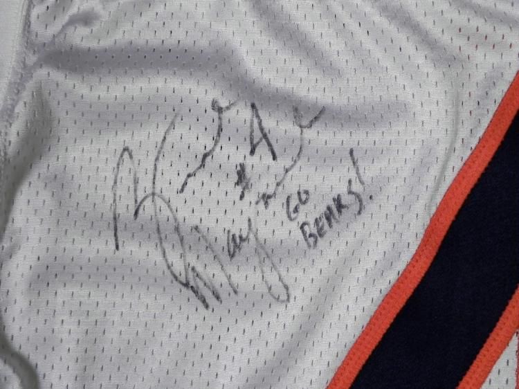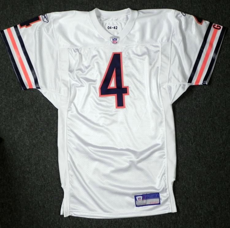 Punter Brad Maynard signed this authentic game jersey, along with his number, and an inspiring cheer "Go Bears!" The autograph is in black Sharpie. The jersey is a genuine NFL Reebok On Field, size 42, with sewn satin numbers, and size and number stiched inside at the collar. It is in excellent condition. * You'll be ready to cheer on the Bears with this great authentic jersey!