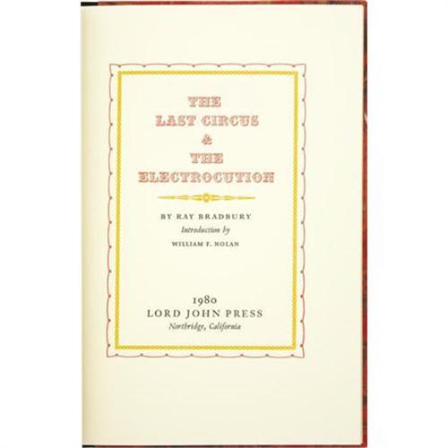 <B>Ray Bradbury. </B></I><B><I>The Last Circus & The Electrocution, </B></I></B></I><B>Numbered and Signed</B></I><B><I>.</B></I></B></I><B> </B></I>Northridge, CA: Lord John Press, 1980.<BR> <BR>A beautiful production, with red marbled paper boards over a black cloth binding with gilt decoration; gilt lettering on spine. Goldenrod endpapers. Signed on limitation page by Ray Bradbury, illustrator Joseph Mugnaini, and William F. Nolan, who wrote the introduction. Boards are solid, fresh and undamaged; corners are sharp and firm; occasional white smudges to boards. Textblock is pristine, in as-new condition. Housed in a red cloth slipcase; goldenrod label with red type. Three small cuts to cloth on front of case. An exceptional Bradbury item in very fine condition. <I>From the Robert and Diane Yaspan Collection.</B></I><BR><BR><b>Shipping:</b> Books & Catalogs (<a target="_blank" href="http://www.heritageauctions.com/common/shipping.php">view shipping information</a>)