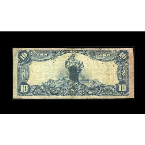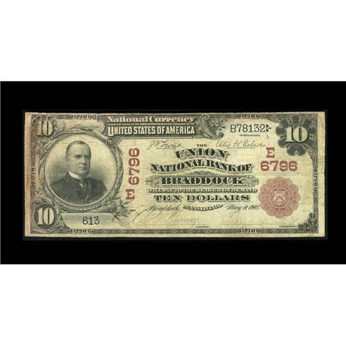 <B>Braddock, PA</B></I> - $10 1902 Red Seal Fr. 613 <B>The Union NB</B></I> Ch. # (E)6796<BR>This note from a short lived bank is unique to the best of our knowledge. The signatures are faded, yet legible. The cashier is Mr. Kinney, while the vice president is Chas. Zugswith. The note shows a bit of light staining on the back, but it easily makes up in rarity what it lacks in grade. <B>About Fine.</B></I>