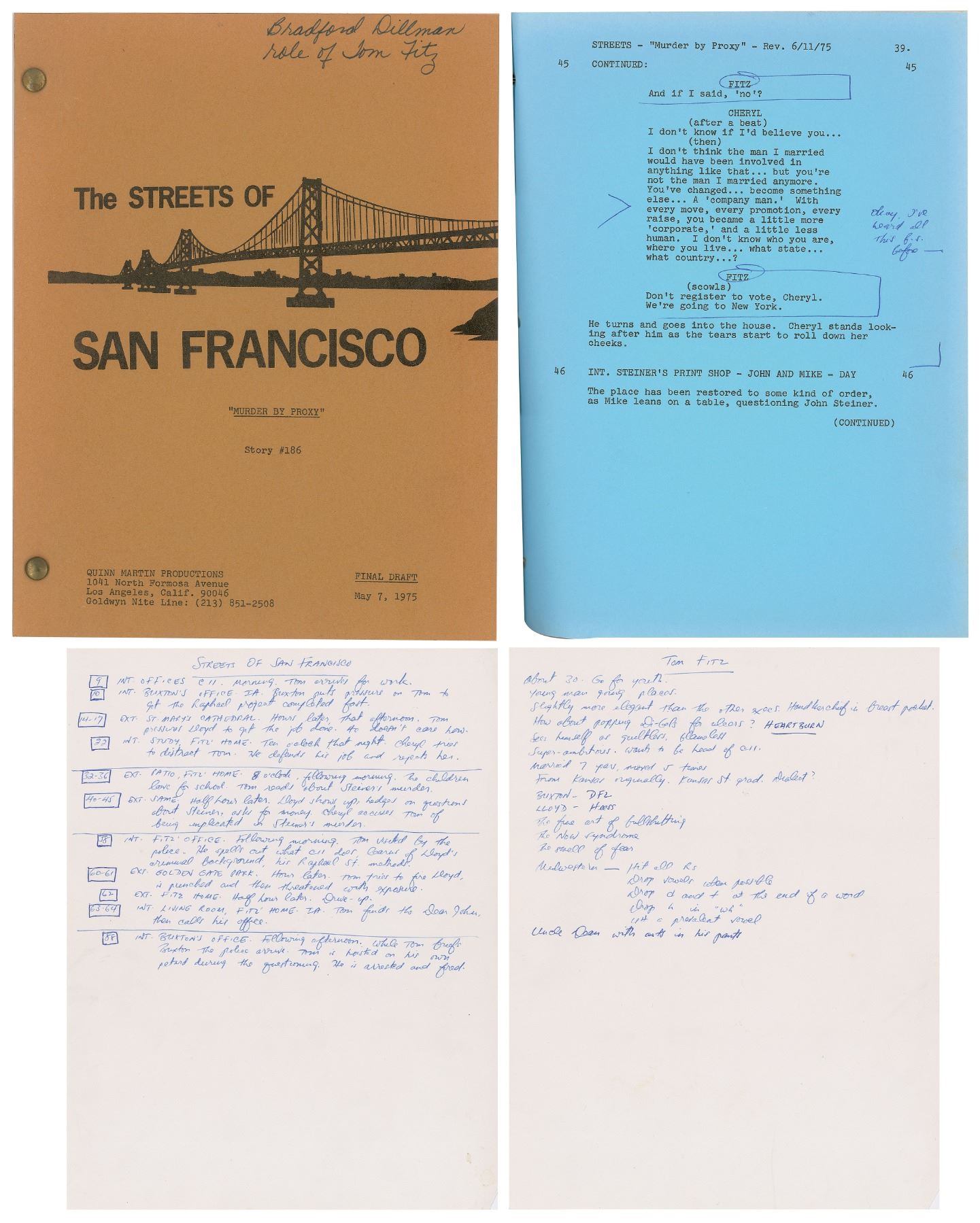 Brad-bound final draft script belonging to actor Bradford Dillman for The Streets of San Francisco episode 'Murder by Proxy,' season four, episode seven, 68 pages, 8.5 x 11, dated May 7, 1975, marked on the front cover in black ink, "Bradford Dillman, role of Tom Fitz." Dillman circles his character name, brackets each of his dialogue lines, and makes a handful of notes in blue ballpoint throughout the script. Also included are two off-white 8.5 x 11 sheets that contain extensive notes related to Dillman's scenes and character. In overall fine condition, with expected wear from use.