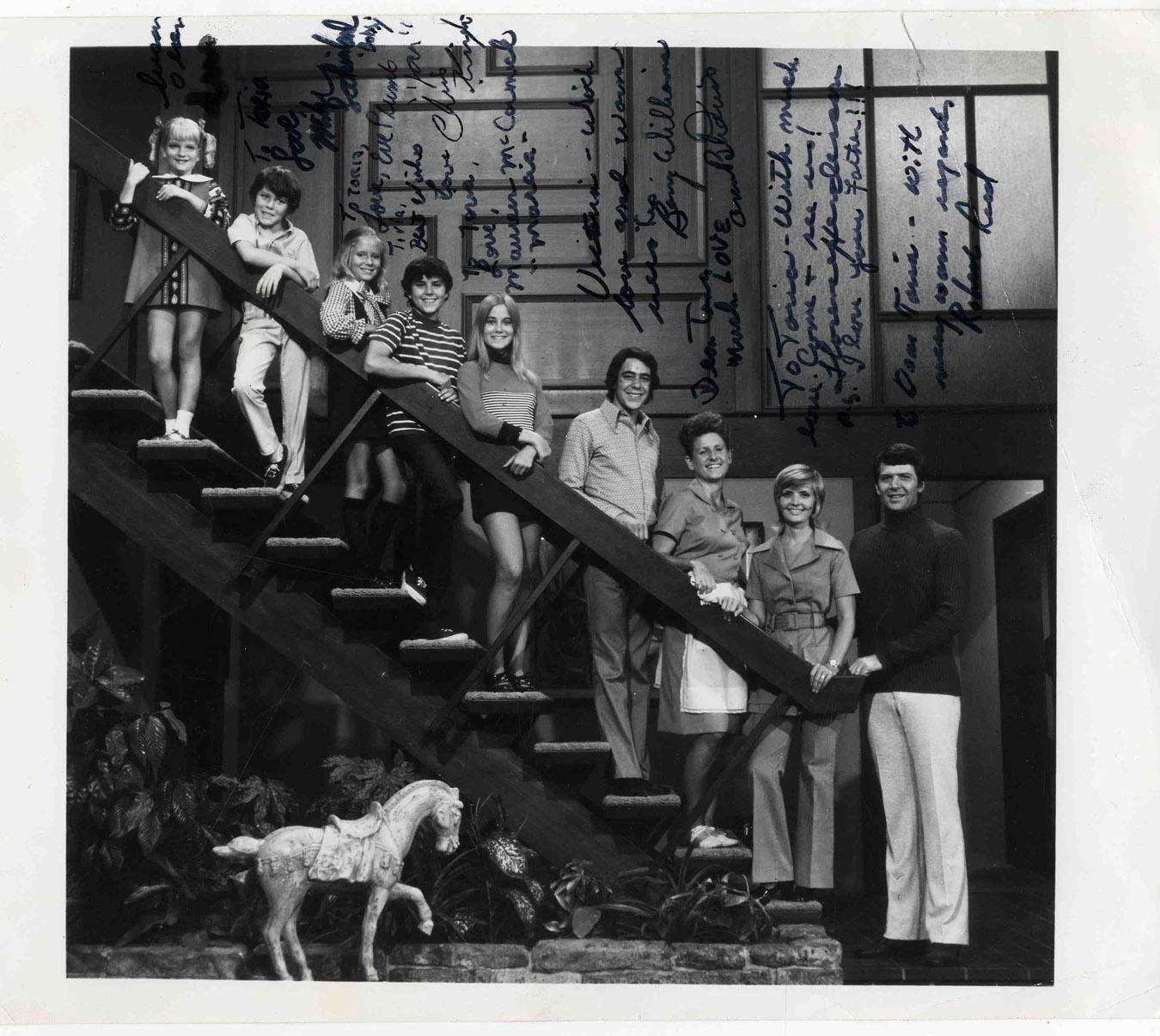 Rare ''Brady Bunch'' 10'' x 8'' black & white glossy photo signed and inscribed by each of the original nine cast members. Photo depicts the entire smiling family stacked like dominoes on their staircase. Originally inscribed in black felt tip pen to Mary Victoria Price, daughter of famed actor Vincent Price, with a few signatures very lightly smudged. Photo has creasing to corners, including a 6.5'' crease running diagonally at upper right through Robert Reed's rare signature and producing .5'' rip at top. Very good condition overall.