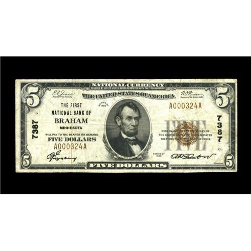 <B>Braham, MN</B></I> - $5 1929 Ty. 1 <B>The First NB</B></I> Ch. # 7387<BR>This <B>Very Fine</B></I> example is one of only three $5 1929 type 1 notes documented from here in the overall small size census of 17. Scarce enough as a type to be worth in the range of...