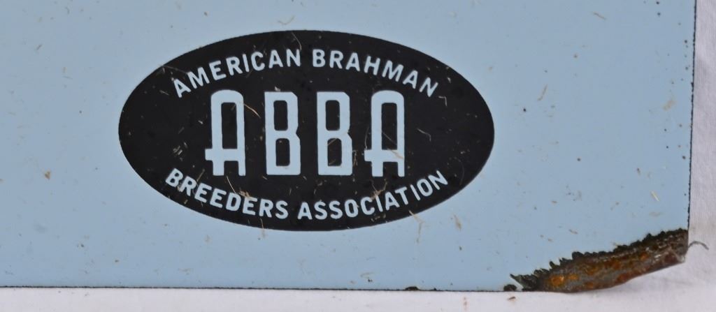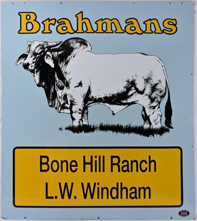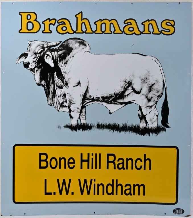 Excellent condition baby blue double sided porcelain Brahma sign, Bone Hill Ranch L.W. Windham. Measures 48" x 54".