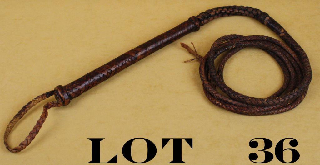 Braided leather bull whip in overall fair condition with separation of the whip from the grips (easily repaired); unknown age. A great decorator. Est.: $50-$75.