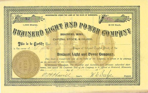 1887, Minnesota. Stock certificate for 50 shares. Black on yellow paper with gold seal and overprint. Uncancelled. Very fine.