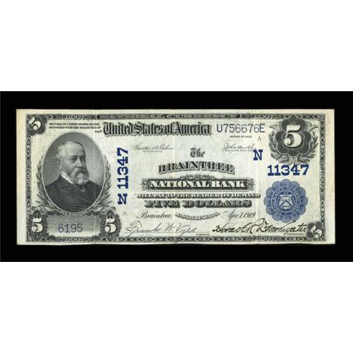 <B>Braintree, MA</B></I> - $5 1902 Plain Back Fr. 606 <B>The Braintree NB</B></I> Ch. # (N)11347<BR> A high grade large example from the only bank in town to issue. Bright <B>Extremely Fine,</B></I> with clear signatures. <BR><BR><b>Shipping:</b> Coins & Currency (<a target="_blank" href="http://www.heritageauctions.com/common/shipping.php">view shipping information</a>)