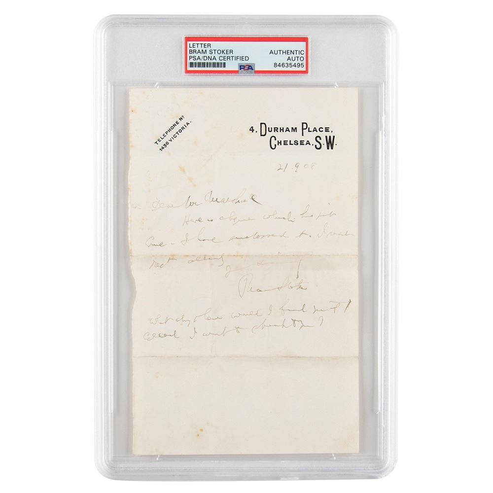 ALS, one page, 5 x 8, 4 Durham Place, Chelsea letterhead, September 21, 1908. Handwritten letter to Mr. Marshall, in full: "Here is cheque which has just come. I have endorsed it. I sent rec't along." Stoker adds a postscript: "What day then would I find you if I called I want to speak to you." In very good to fine condition, with scattered soiling and creasing. Encapsulated in a PSA/DNA authentication holder.
