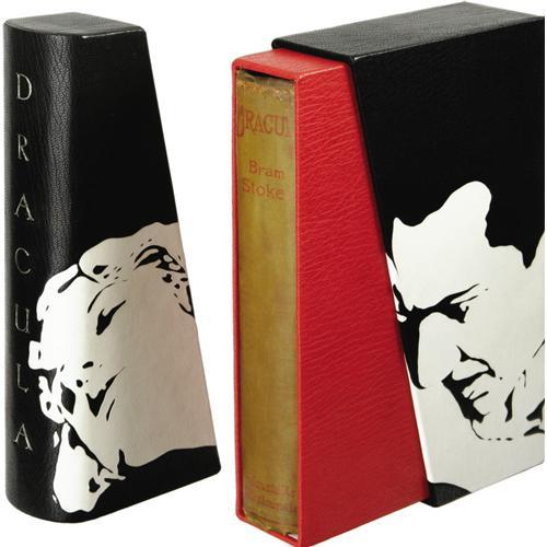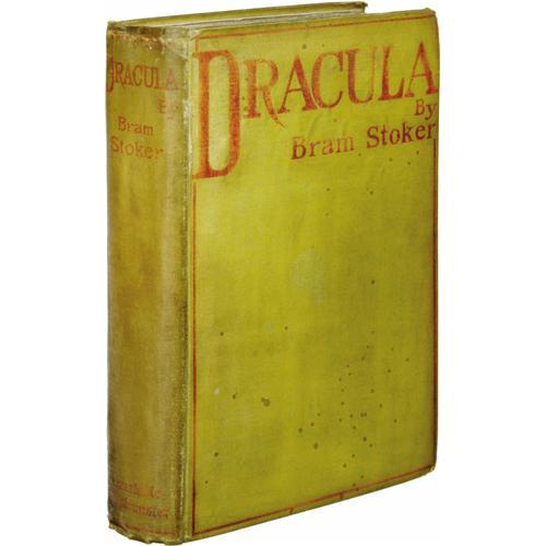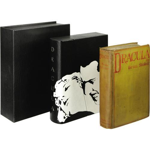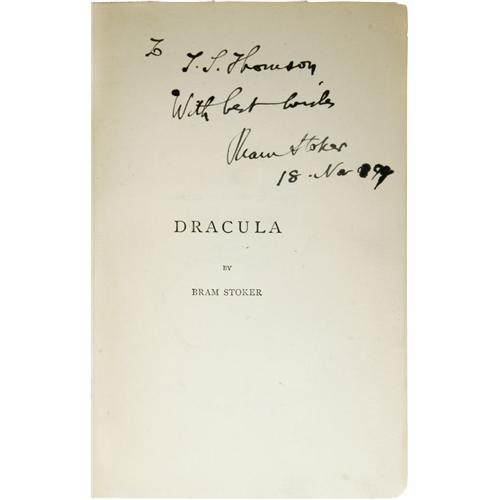 <B>Bram Stoker <I>Dracula</B></I></B></I> (Westminster: Archibald Constable and Company, 1897), first edition, 3rd issue (with the Shoulder of Shasta advertisement following the text on page 392), 390 pages, 8vo (5.5" x 8"), original mustard cloth boards with red lettering and design. Inscribed on the front free endpaper "<I>To J. J. Thomson With Best Wishes Bram Stoker 18. Nov 1899</B></I>". The J. J. Thomson in question may be the renowned English physicist who was the Honorary Professor of Physics, Cambridge and Royal Institution, London. In 1906, he won the Nobel Prize for physics. Accompanying the book is a beautiful and unique hand-made leather slipcase and box by the legendary bookbinders of Sangorski & Sutcliffe with their anthemion located on the bottom of the back cover. This distinguished binding firm, established in 1901 and famed for their elaborate and original bindings worked with gilt fittings and precious stones, is perhaps best known as the creator of a magnificent, jewel-encrusted binding of Omar Khayyam's <I>Rubaiyait</B></I> which, having taken two years to complete, was lost in 1912 with the sinking of the <I>Titanic.</B></I> The slipcase is supple black leather with applied white leather to form the stark image of Count Dracula about to feast on the neck of Mina Harker. The slipcase is fully enclosed in a custom box of similar black leather with impressed title lettering on the spine. The case and slipcase are, themselves, a work of art. Though early editions of this book are rarely found, they are typically in rather poor condition. This copy, however, is in very good condition with the typical darkening to the spine, some discoloration to the cover from handling, small areas of the cloth have come loose from the boards near the title area of the front cover, the front and rear hinges are broken but not separated, there is toning to the inside front cover and free front end paper as a result of contact with high-acid content paper (likely newspaper), and the book slightly canted. This is a unique opportunity to own a classic of the horror genre.<BR><BR><b>Shipping:</b> Books & Catalogs (<a target="_blank" href="http://www.heritageauctions.com/common/shipping.php">view shipping information</a>) <BR><BR><B>Important notice:</