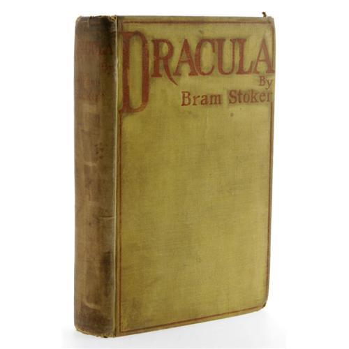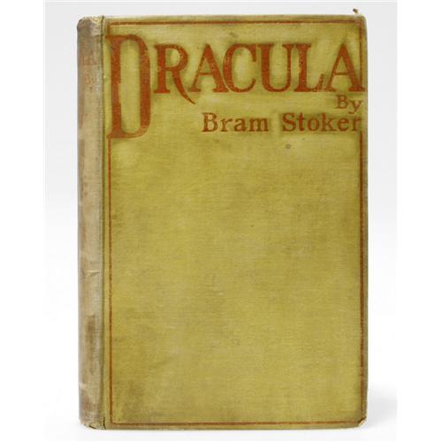 <B>Bram Stoker Signed First Edition Book: <I>Dracula</B></I></B></I> (Westminster [London]: Archibald Constable and Company, 1897), first edition, presumed first printing, first issue with no advertisements, viii-ix, 390 pages, yellow cloth with red lettering, signed and inscribed to Stoker's brother on the free front endpaper "<I>Thornly Stoker from Bram 29.5.95</B></I>". This is one of the most famous horror novels of all time and first editions are rare and sought-after. We feel privileged to be able to offer not only a first edition, but one signed by the author to his brother who helped him research the book! William Thornley Stoker was a prominent surgeon whose medical notes on transfusions and autopsies were found on Bram's early manuscript of this book and whose own experience with a mentally ill wife is echoed by that of Van Helsing in the novel. Only good condition, covers stained and worn, corners bumped, hinges cracked, still an incredibly desirable and rare copy of a landmark book. When Count Dracula said, "there are far worse things awaiting man than death," was he speaking of not bidding on this book?