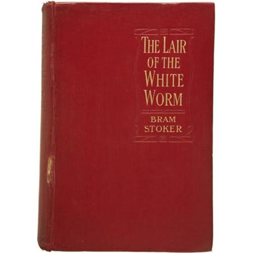 <B>Bram Stoker. </B></I><B><I>The Lair of the White Worm</B></I></B></I><B>.</B></I> London: William Rider and Son, 1911.<BR><BR>First edition. Stamped "Presentation Copy" on the title page. Twelvemo. 324 pages, 4 pages of advertisements, 16 page publisher's catalog. Six color illustrations with the plate noted in the "List of Illustrations" as facing p. 294 utilized as the frontispiece as usual.<BR><BR>Original red cloth with decoration in blind and titles in gilt on the spine and front board. Corners bumped. Small one inch tear along the edge of the spine. General shelf wear. Light foxing internally mainly on the preliminary pages. A very good copy. <I>From the Robert and Diane Yaspan Collection.</B></I><BR><BR><b>Shipping:</b> Books & Catalogs (<a target="_blank" href="http://www.heritageauctions.com/common/shipping.php">view shipping information</a>)