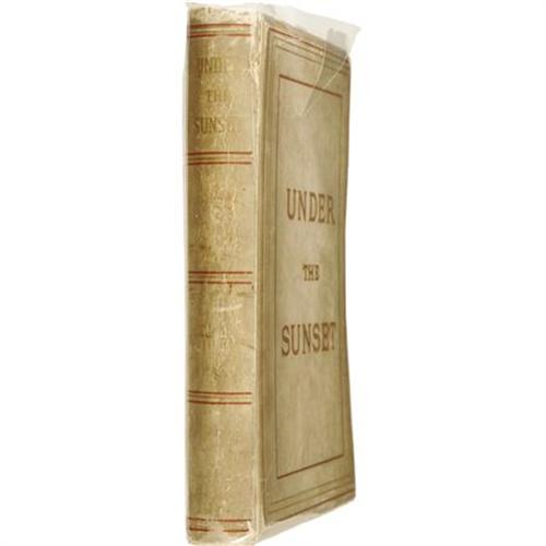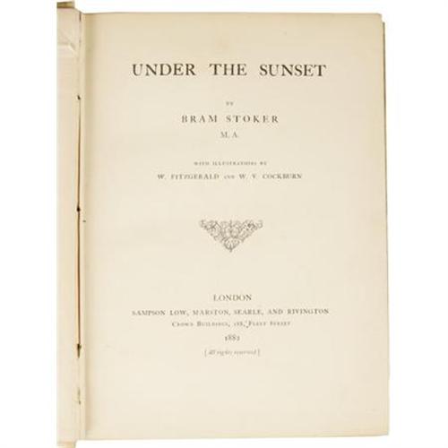 <B>Bram Stoker: <I>Under the Sunset</B></I></B></I> (London: Chiswick Press, C. Whittingham & Co. for Sampson Low, Marston, Searle, and Rivington, 1882), first edition, 190 pages, publisher's off-white imitation vellum with beveled edges, gilt titles (outlined in red on the front board), front and spine panels bordered and lined in red and gilt, and rear panel outlined in red, 8vo (6" x 8"), no dust jacket (as issued), thin plastic cover over boards. All edges gilt. Yellow floral endpapers. Illustrations by W. Fitzgerald and W. V. Cockburn. A collection of eight dark fantasy tales, including "Under the Sunset", "The Rose Prince", "The Invisible Giant", "The Shadow Builder", "How 7 Went Mad", "Lies and Lilies", "The Castle of the King", and "The Wondrous Child". The book is in very good condition, with rubbing to the boards, minor shelf wear, and two small splits along the outer spine folds, not seriously affecting the structural integrity of the book. The inner textblock shows minimal scattered foxing, mostly confined to the first few leaves. A handsome edition of the first book from the author who later terrified the world for all time with <I>Dracula</B></I>.<BR><BR><b>Shipping:</b> Books & Catalogs (<a target="_blank" href="http://www.heritageauctions.com/common/shipping.php">view shipping information</a>)