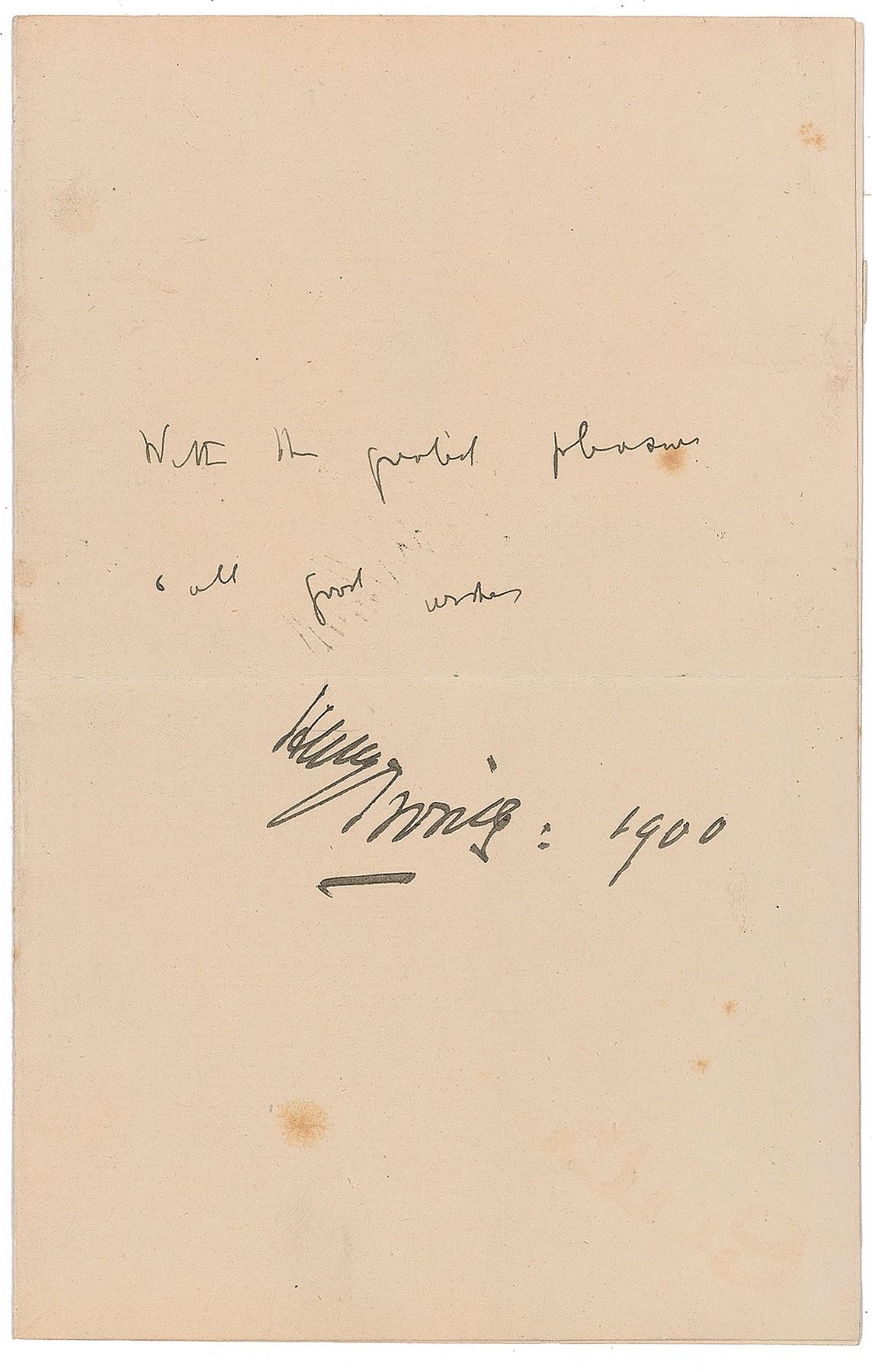 LS signed "Henry Irving: 1900," written in the hand of his secretary, Dracula author Bram Stoker, one page, 5 x 8, Lyceum Theatre letterhead, 1900. Stoker writes, in part: "With…pleasure & all good wishes." In fine condition, with scattered foxing and a central horizontal fold. Stoker worked as business manager for Henry Irving's world-famous Lyceum Theatre in London between 1879 and 1898, where he supplemented his income by writing a large number of sensational novels—his most famous being the vampire tale Dracula, published in 1897.