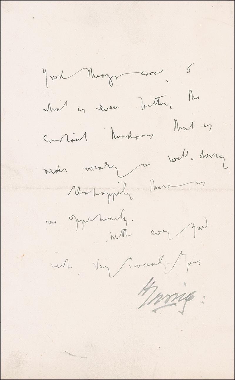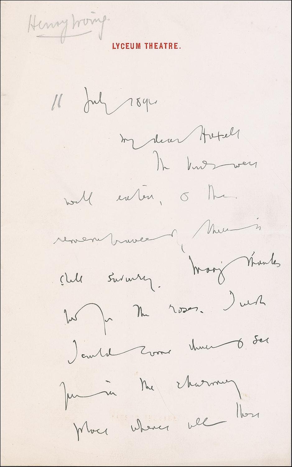 Stoker was an Irish author (1847–1912) best known for his horror classic Dracula. Irving (1838–1905) was a prominent British stage actor who was the first of his profession to be knighted. LS, signed “H. Irving,” written in the hand of his secretary, Dracula author Bram Stoker, two pages, 5 x 8, Lyceum Theatre letterhead, July 11, 1896. Brief letter to an unidentified gentleman sending good wishes and thanks for roses, and expressing his wish to see the recipient. Mild soiling, handling wear, and a pencil notation to top edge, otherwise fine condition.