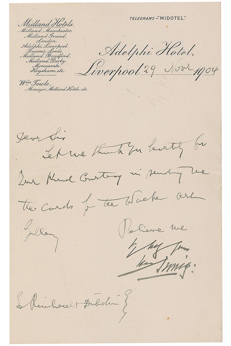 Stoker was an Irish author (1847–1912) best known for his horror classic Dracula. Irving (1838–1905) was a prominent British stage actor who was the first of his profession to be knighted. LS signed “Henry Irving,” written in the hand of his secretary, Bram Stoker, one page, 5 x 8, Adelphi Hotel letterhead, November 29, 1904. Brief letter of thanks. In full: “Let me thank you heartily for your kind courtesy in sending the cards for the… art gallery.” In fine condition, with mild scattered creases and some light mirroring of signature.