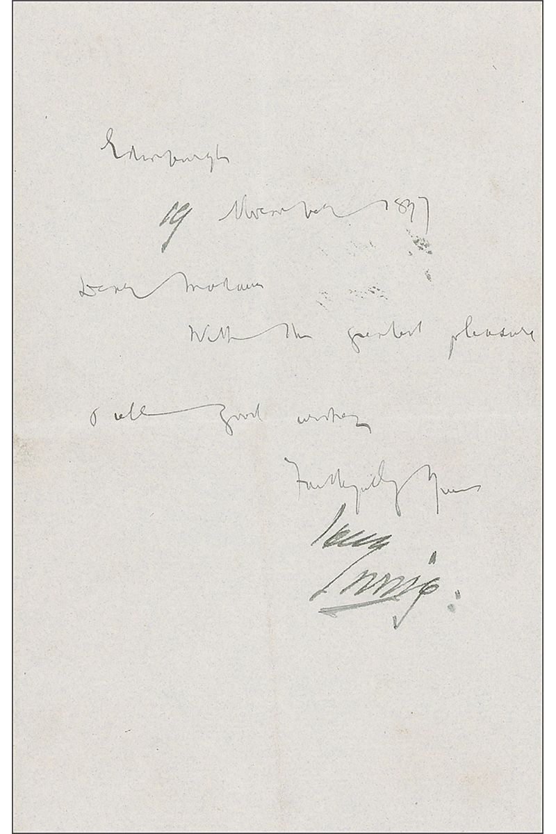Stoker was an Irish author (1847–1912) best known for his horror classic Dracula. Irving (1838–1905) was a prominent British stage actor who was the first of his profession to be knighted. LS signed “Henry Irving,” written in the hand of his secretary, Dracula author Bram Stoker, one page, 4.5 x 7, November 19, 1877. Stoker pens the body, in full: “With the greatest pleasure & all good wishes.” In fine condition, with central horizontal and vertical fold, and a few stray ink spots.