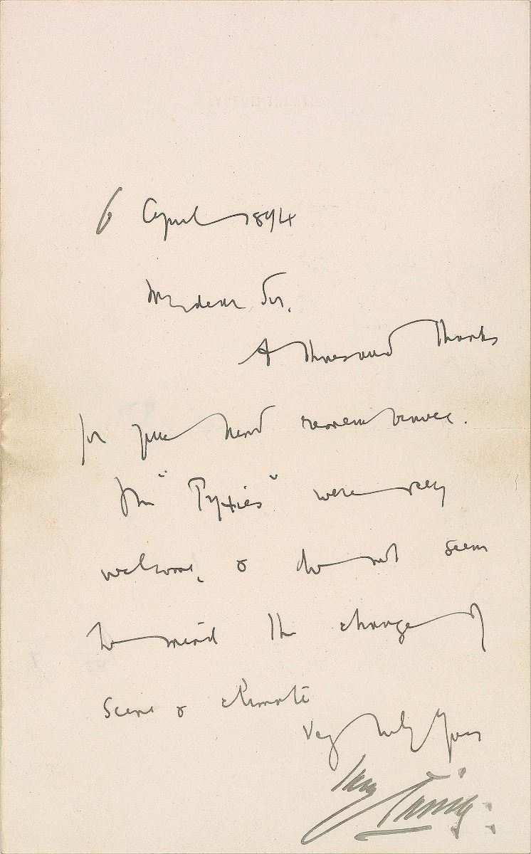 LS signed “Henry Irving,” written in the hand of his secretary, Dracula author Bram Stoker, one page, 5 x 8, Lyceum Theatre letterhead, April 6, 1894. In part: “A thousand thanks…the ‘Pyxies’ were very welcome, & do not seem to mind the change of scene & climate.” In fine condition. Accompanied by an unsigned engraved portrait of Irving.
