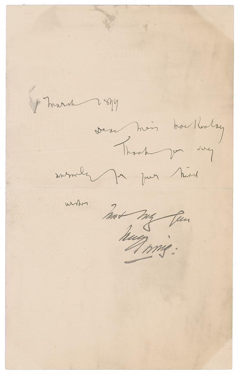 Irish author (1847–1912) best known for his horror classic Dracula. Henry Irving (1838–1905) was a prominent British stage actor who was the first of his profession to be knighted. LS, signed “H. Irving,” written in the hand of his secretary, Dracula author Bram Stoker, one page, 4.5 x 5.75, Lyceum Theatre letterhead, March 1879. Brief letter to a woman. Stoker pens the body, in full, “Thank you very warmly for your kind words.” Scattered toning and soiling, and a few stray ink marks, other wise fine condition.