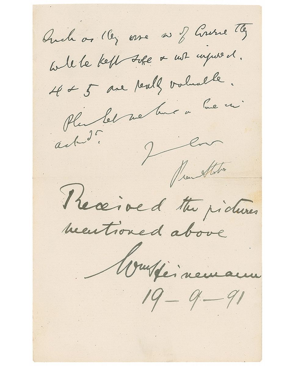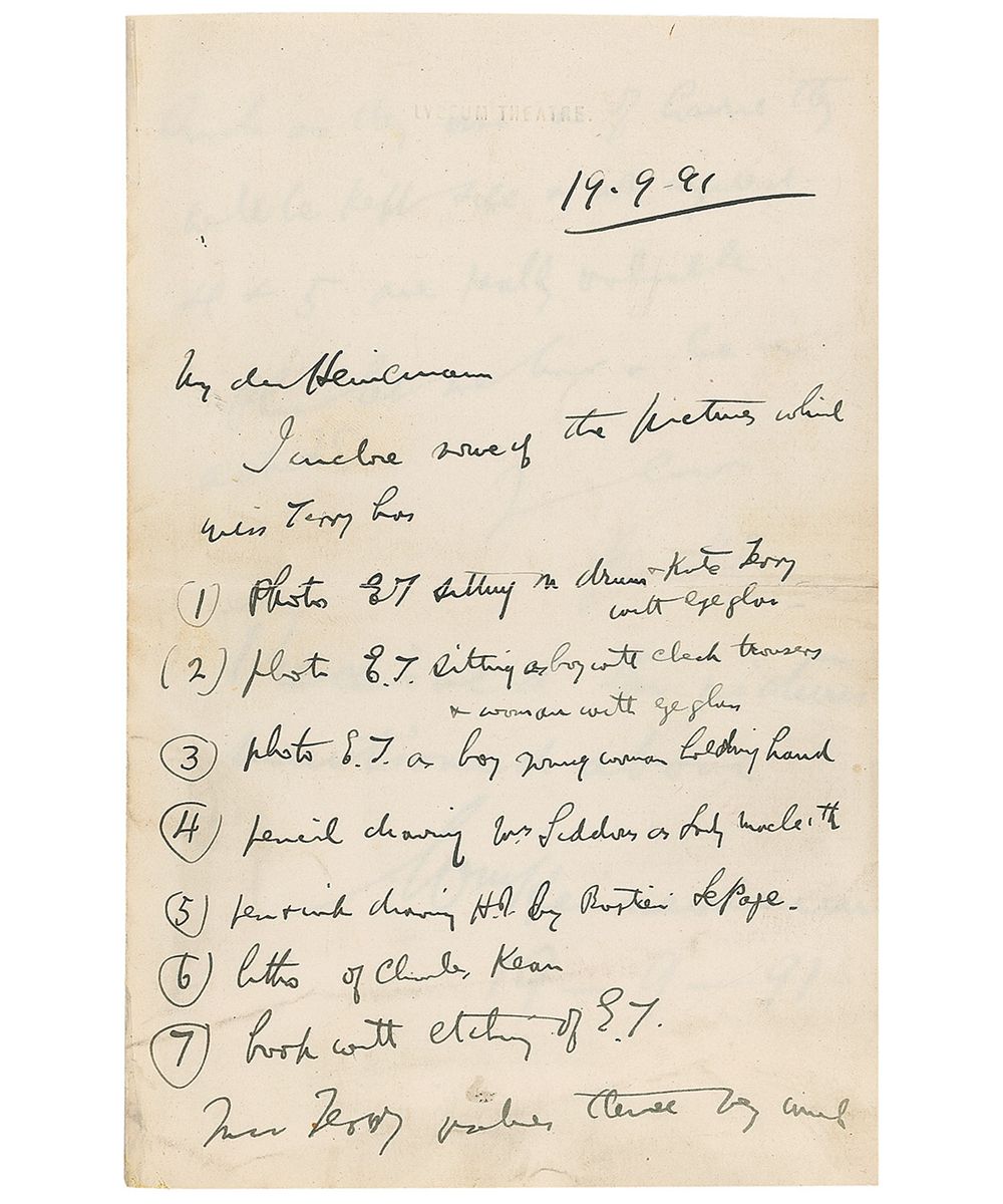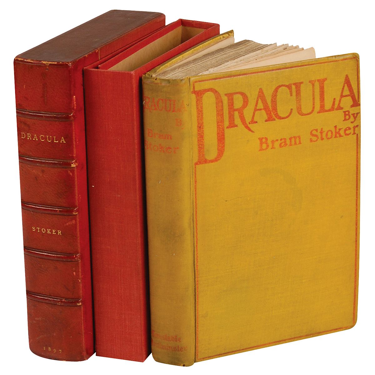 Incredibly scarce first [British] edition, second issue of Dracula, Westminster, England: Archibald Constable and Company, 1897. Hardcover, 5.25 x 7.75, 390 pages. Book condition: G+/None. Original yellow cloth-covered boards with orange lettering to cover and spine, front board outlined in orange box; spine sunned; exterior and margins of a few pages soiled; light foxing to textblock edges and a few pages; front and rear hinges neatly repaired; few interior hinges cracked; previous owner’s gift inscription to ffep. Rear flyleaf bears The Shoulder of Shasta ad; no additional publisher’s catalog included. In protective mylar sleeve, housed in a red cloth chemise and quarter red morocco and cloth slipcase with gilt lettering and raised bands to spine. ALS, two pages on two adjoining sheets, 5 x 7.75, Lyceum Theatre letterhead, September 19, 1891. A letter to London publisher William Heinemann. In full: “I enclose some of the pictures which Miss Terry has 1. photo ET [Ellen Terry] on drum & Kate Terry with eyeglass. 2. photo E.T. sitting as boy with black trousers 85 woman with eyeglass. 3. photo E.T. a boy young woman holding hand 4. pencil drawing Mrs. Siddons as Lady Macbeth. 5. pen 85 ink drawing H.I. [Henry Irving] by Bastien Lepage. 6. letter of Charles Kean. 7. book with etching of E.T. Miss Terry values these very much such as they are & of course they will be kept safe & not injured. 4 & 5 are really valuable. Please let me have a line in acknowledgement.” Letter is in very good condition, with scattered toning and soiling, a small separation to spine, and horizontal fold through portion of first name of signature. This letter was written to Heinemann the year before he started his publishing company.