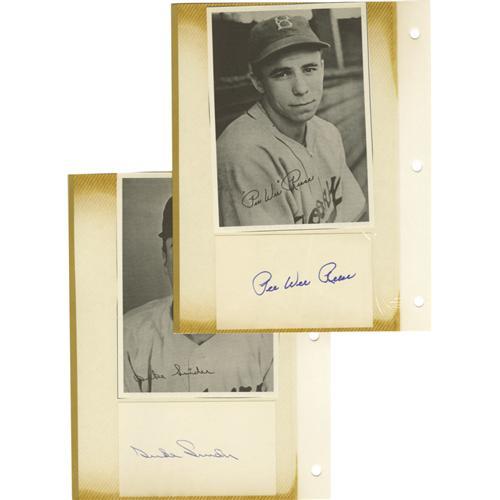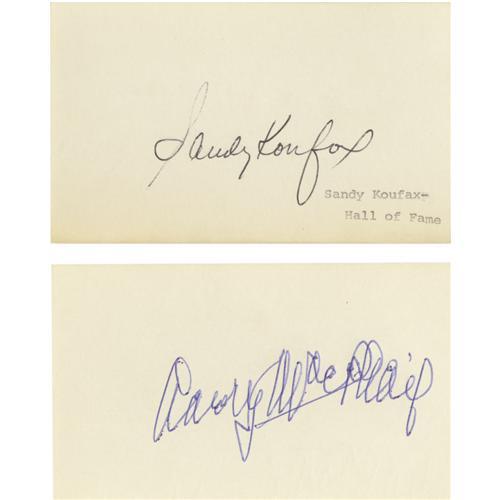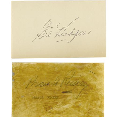 <B>Brooklyn Dodgers Signed Index Cards Lot of 43 with Branch Rickey, Gil Hodges.</B></I> More Bums than a Bowery soup kitchen here, as one collector has compiled an assortment of Ebbets residents sure to please collectors and dealers alike. Scarcest in the lot is Branch Rickey, the man who sent Jackie Robinson across the color line. The autograph rates a 9/10, but is unfortunately coated with some form of shellac that has turned the card the color of rust. Other notables include Hodges, Koufax, MacPhail, Durocher, Newcombe, Reese, Snider, Furillo, Branca, Podres and more. A few of the autographs (none listed) are trimmed to cuts smaller than standard 3x5" index card size, but all project as 9/10 or better, with no noteworthy flaws to the cards with the obvious exception of the Rickey specimen. Great break down value here. <I>LOA from PSA/DNA.</B></I> <BR><BR><B>Important notice:</B> Heritage usually auctions material at the rate of 200-250 lots per hour. On some occasions eBay Live bid software or the Internet may not be able to keep up with the pace of the auction. We recommend placing a realistic absentee bid now as insurance to avoid disappointment. Occasionally the auctioneer may eliminate or reject an eBay Live bid, and the auctioneer may also reopen a lot after the close of the eBay live bidding (usually because we missed an audience bid), and may reject your bid even if it shows you as the winning bidder. By bidding via eBay Live, you agree that Heritage may award the lot to another bidder at its sole discretion under the circumstances described above or any other reasonable circumstances. Since eBay bids are not shown to us until we open the lot on the floor, we treat those bids just like floor bids. In most cases the floor responds before the eBay bid is presented to us, due to Internet lag time, so for consistency we have made it a policy that floor bids are always considered first over tie eBay live bids. Also please note that all Heritage lots purchased through eBay Live carry a 22.5% Buyer's Premium. Please make sure you read the Terms and Conditions before you bid. This lot is being auctioned in conjunction with a live floor auction by Heritage Galleries & Auctioneers. All final auction and invoice information will be supplied by Heritage Galleries & Auctioneers, and all other information should be considered preliminary. Lot:19094 <BR><BR><B>Winning Notification and Billing:</B> After the FINAL session in this auction is complete, Heritage will send e-mail and snail mail invoices. This process normally takes several days. All final auction and invoice information will be supplied by Heritage Galleries & Auctioneers, and all other information should be considered preliminary. <BR><BR>This auction will be conducted on a live auction floor and over the Internet through eBay Live. If you choose to place an absentee bid, please take a moment to <font color='#0000ff'><u><a href='http://pages.ebay.com/liveauctions/help/before/laabsentee.html'>learn how eBay Live absentee bidding works</a></u></font><font color='#000000'>