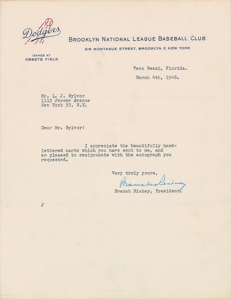 Baseball executive and Hall of Famer (1881–1965) best known for signing Jackie Robinson to the Brooklyn Dodgers. TLS, one page, 8.5 x 11, Brooklyn National League Baseball Club letterhead, March 4, 1948. Letter to L. J. Sylvor, in full: “I appreciate the beautifully hand-lettered cards which you have sent to me, and am pleased to reciprocate with the autograph you requested.” In fine condition.