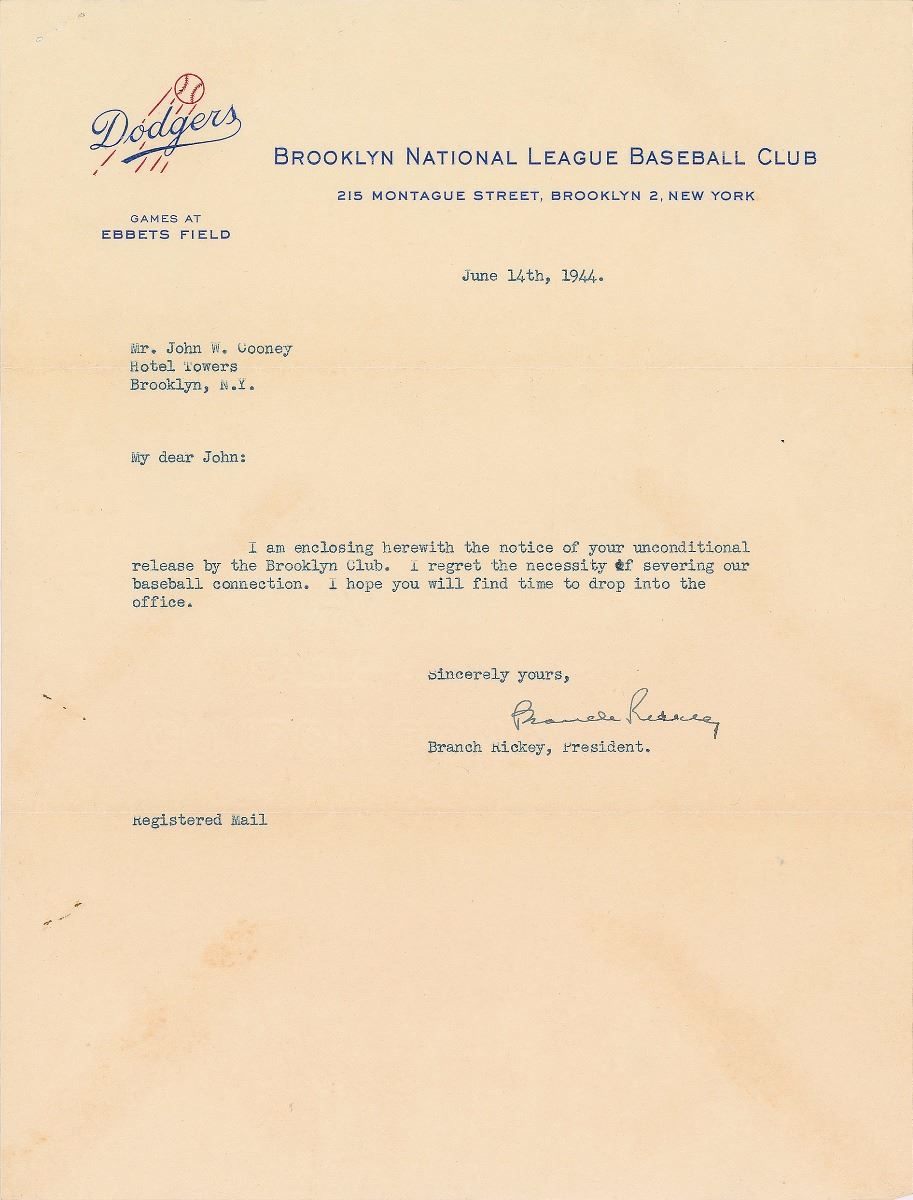 TLS, one page, 8.5 x 11, Brooklyn National League Baseball Club letterhead, June 14, 1944. Letter to John W. Cooney, in full: “I am enclosing herewith the notice of your unconditional release by the Brooklyn Club. I regret the necessity of severing our baseball connection. I hope you will find time to drop into the office.” In fine condition, with staple holes to upper left corner and some light toning. Johnny Cooney enjoyed a 20-year career as a multi-positional baseball player for teams such as the Boston Braves, the Brooklyn Dodgers, and the New York Yankees. After his playing career, Cooney spent another twenty years as a manager.